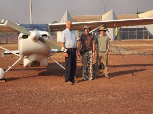 All in all, we lost an additional three days in Douala. On the morning of December 31, we loaded the battery and the raft into our taxi and drove several hours back to Yaounde. At the airport we found that our luggage had arrived from Senegal. Next, we rented a large van that could carry all our gear and traveled several hours east to the small city of Bertoua. We arrived at 2:30am. Early the next morning we got up to do a fly over of our target area with missionary pilot Tom Needham. [Figure 7]