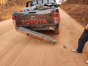 Pierre had rented a 4X4 pickup to take us and all our gear south to the Boumba River. It was a 10-hour trip. Since time was now of the essence, we obtained an assurance that the driver would be there at 8:00am sharp. But the pickup and driver didn’t show up till 3:00pm. It seems that the vehicle had some mechanical issues and was being serviced. I’m not sure how much good the mechanic did because the alternator gave out and the battery died shortly after we left Bertoua. We had to jump start the pickup multiple times. Then the car’s back bumper fell off. [Figure 8] Nonetheless, we made it to the frontier town of Yakadouma (without lights) just as night was falling. The next morning, we started out early for the Boumba River. I knew from our maps that there was a ferry crossing where we could easily put in, just below the town of Kongo. We arrived at the river’s edge, inflated our raft, attached the electric motor, mounted our GoPro on the front, loaded our gear, and started downstream.