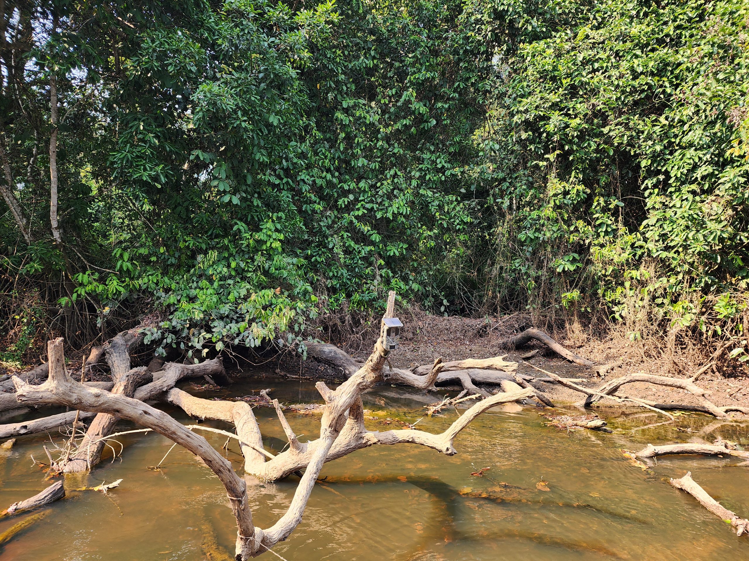 Several times we paused our journey downstream to investigate sandbars and muddy islands where we hoped to observe animal tracks. On the seventh day, we stopped at a particularly large sandbar. I saw a large footprint of an animal that had apparently walked upstream, stepping just one time onto the sandbar. Our guide, who was trained in tracking, said it was not an elephant footprint. But the track was too obscure to say for certain what it was. We placed multiple motion-activated trail cameras along the river at strategic locations. We particularly chose places where the rivers merged. [Figure 12] The French researcher Michel Ballot plans to make an expedition to Cameroon later this year and he hopes to retrieve these cameras.