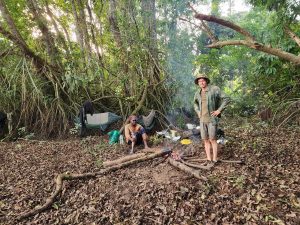 At the end of a long day on the river, we always looked forward to making camp. We scouted out a fairly level, dry stretch of riverbank where we could prepare our campsite, a location that had some trees for hanging hammocks. Jungle hammocks are much better than tents on expeditions where the terrain is uneven, or the ground is muddy. The hammocks are lightweight, go up quickly, and are very flexible (even for attaching to large roots). [Figure 10] After getting our hammocks hung, we made a fire for cooking and drying out our wet clothes & sleeping bags. We boiled river water, added some dried foodstuffs, and made up a stew dinner. Often pygmy fisherman would come from the surrounding areas to watch us make camp. The hammocks fascinated them to no end…as did our pumping river water through a filter into our canteens.