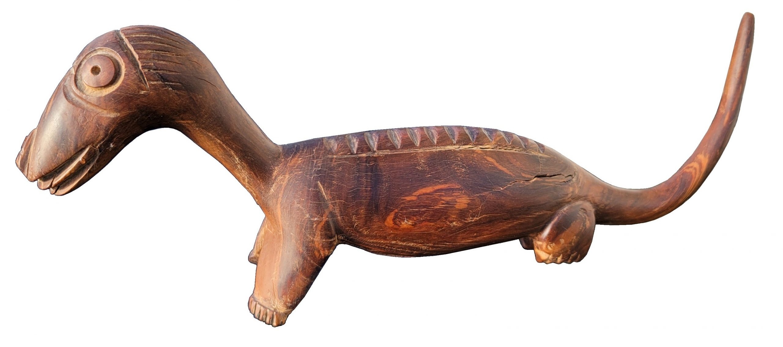 After returning from Cameroon in 2000, I continued to research evidence for a sauropod in equatorial Africa. I came upon a couple of intriguing wood carvings made by African craftsmen well before the publication of Mokele-mbembe research by recent explorers. The first is an indigenous carving that showed up in a souvenir shop in the Congo in the early 1980s. [Figure 4] The tribal artist was clearly trying to depict a long-necked, long-tailed animal. Notice that it seems to be herbivorous (no sharp teeth depicted). The sturdy legs and upright posture match up well with the general morphology of a sauropod, though the appendages are unrealistically short. Perhaps the artist had only seen the animal in the water. Curious markings are seen going down the back. Are these an attempt to depict a dermal frill—something like the spikes that modern paleoartists draw on sauropods? The reptile is accurately shown without an outer ear. The whole piece is 15″ long and stands 6″ tall.