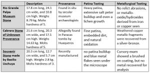 A second lab analysis was undertaken, utilizing a completely different authentication methodology. The same three Ica Stones were submitted to a lab specializing in metallurgical analysis. Our hypothesis was that poor Peruvians would have utilized readily-available modern tools like Ushuyai had done if they were mass-producing Ica Stones for Cabrera. Ancient stone artifacts, on the other hand, would likely give evidence of a Bronze-Age production. “Compositional analyses can identify the alloys made by the ancient people, help in the authentication of items with uncertain origin (i.e. not excavated from well-controlled archaeological environments), bring information on the employed metallurgical procedures, and, in the case of very ancient artefacts, provide hints about the raw materials provenance.” [xvi] Metallurgical analysis also would not be influenced by any “artificial aging” patina applied to fake stones.