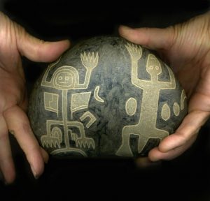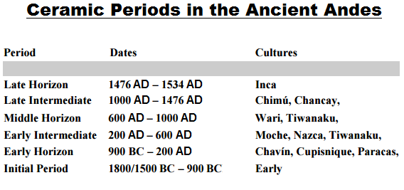 The Ica and Nazca valleys in southern coastal Peru enjoyed a rich history as tribal Indian groups rose to prominence, like the prominent Nazcan culture which lasted from 200 BC to approximately 700 AD and the Ica culture which flourished from about 600 AD to almost 1200 AD. [i] [ii] Tribal groups like the Nazcas, Icas, Wari, and especially the Paracas left behind numerous beautiful artifacts buried in their desert tombs. Along with rich fabrics, ancient tools, and detailed gold and ceramic works, are engraved ceremonial stones from these peoples. The stones were first found in the tombs of the Ica Indians and so the generic name “Ica Stones” was applied to all them. Antiquities from this region are typically dated by archaeologists using generalized “Ceramic Periods” (Table 1).