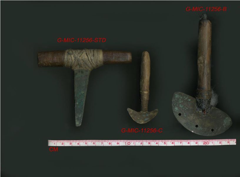 An analysis was commissioned utilizing Chemoptix Laboratory in West Linn, OR, and we submitted the same three stones for examination. The lab requested sample Nazcan tools for metallurgical comparison purposes. Fortunately, we were able to secure three implements of known provenance (Figure 7). Here is a portion of the final lab report:
