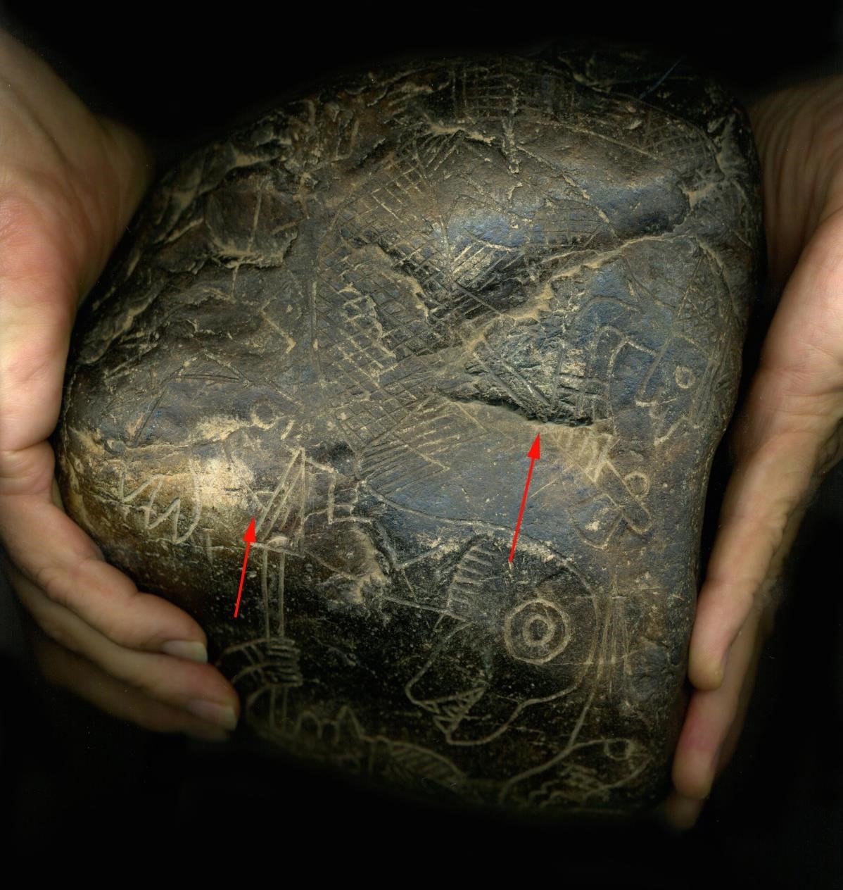 The ‘weathering’ on this stone [souvenir stone] peripheral to the incised figures was brushed on as a paint/coating. There were no conspicuous metal/metallo-oxides within the incisions upon cursory MIC evaluation.” [xvii]