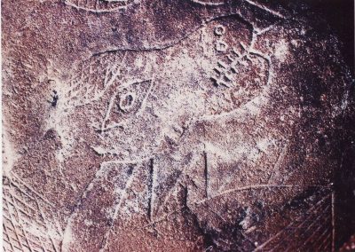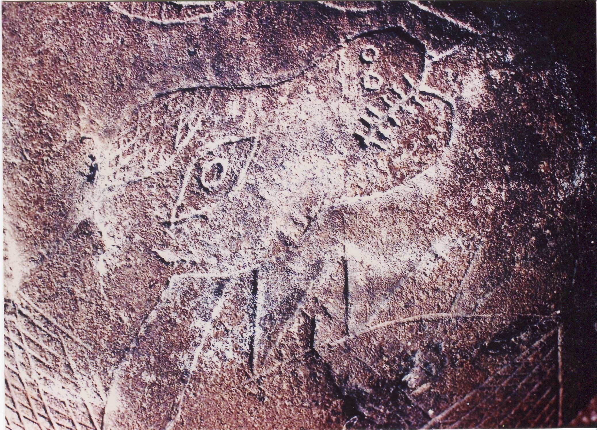 In the spring of 2001, I (Swift) was notified by authorities from the Palpa Museum that they had discovered in-situ an engraved stone displaying dinosaurs and other animals. It had recently been excavated from a Nazcan tomb complex that was dated between 400 and 700 A.D. This burial site is located at the far northern end of the Nazca Desert, just past the popular Nazcan Lines. The simplistic sauropod dinosaur on the stone is somewhat obscured by the extensive patina and not as detailed as most of the Cabrera Stones. There were about thirty eye witnesses to the stone’s discovery, including museum staff archaeologists. The tomb is located beside an irrigation ditch near Rio Grande Palpa, a river valley where it was exposed to an unusual amount of moisture. Because of that, there is an unmistakable patina, along with the typical film of oxidation.