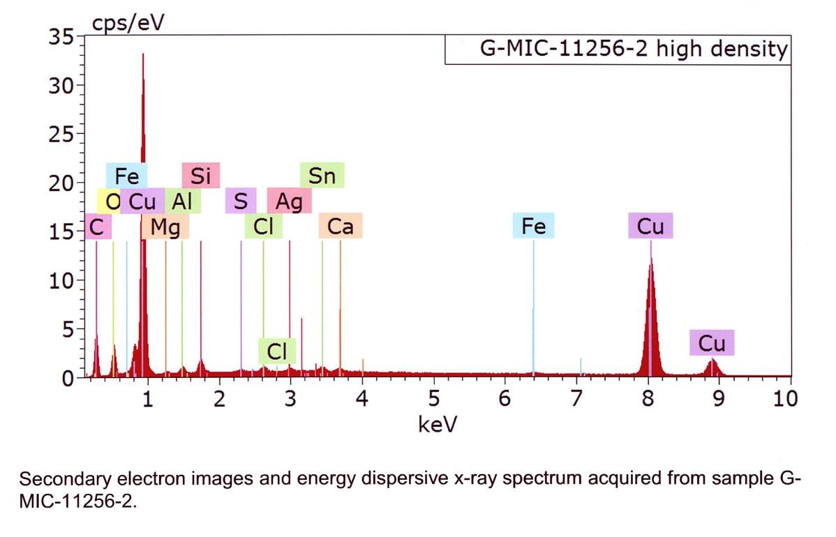 “This basaltic stone [stone of unknown provenance] showed small areas of copper mineralization loosely adhering to the regions of carved incision. The stone incisions also showed abrasion from incision. Although the stone indicated general protection from weathering, copper residues were severely weathered. Nonetheless, a few intact metallic fragments were observed (Figure 8). SEM/EDX [Scanning electron microscopy with energy dispersive X-ray spectroscopy] analysis indicated both scuffing morphology and spectra for a silver-bronze (Figure 9). Weathered zones adjacent to these particles also showed spectra suggesting derivation from this metal; those further from the metal scuffs presented spectra less relatable to the scuffs and indicating a more complex mixture of matrix elements and possibly limited diffusion. Perhaps significantly, no arsenic was recovered from the metal scuffs nor the adjacent weathered regions. This stone [museum stone] showed weathering in its carved incisions on all examined surfaces. On a single planar surface, MIC analysis showed the rock-building minerals altering into secondary mineralization with similar habit but exhibiting expanded volumes related to alteration within the incisions….No relict abrasions, metallic or otherwise, were observed in the incisions on this stone. No metallo-oxide/hydroxides derived from iron nor copper were observed.“The stone surfaces were examined in their entirety using dissection microscopes equipped with episcopic/incident light illumination (MIC). Incision (carved) regions showing possible reacted metal were tape-lifted using carbon tape and analyzed via scanning electron imaging and back scattering (SEM/EDX).