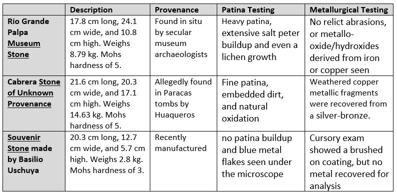 It might seem odd that the museum stone of known provenance did not yield any metal remnants whatsoever for analysis. But we feel this fits with the extensive patina and lichen buildup from the more humid environment. The presence of moisture and the great antiquity of the artifact likely resulted in the complete corrosion of any residual metals. Any remaining corrosion remnants probably are embedded under the thick patina. This scenario is hardly unprecedented.