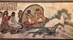 It is well known that the Chinese have historical records of men interacting with dragons. The book Zuozhuan tells the narrative of how the “ancients raised dragons and how the state used the services of two clans known as the Dragon Rearers and the Dragon Tamers” (Sterckx 2012). As early as 1611 BC the Emperor of China appointed the post of Royal Dragon Feeder, an official whose primary responsibility was to deliver food into the sacred dragon ponds. Historical records tell of a Song Dynasty (960-1279AD) Emperor who raised dragons within his palace compound (Niermann 1994). The Song overlapped the construction timeframe of Angkor Wat. The Italian merchant and traveler Marco Polo visited China in the late 13th century and brought back credible dragon reports (Polo 1961, Niermann 1994). Ming Dynasty Chinese landscape painter Wu Bin (1573-1620) served for a time as the Emperor’s secretary. Among his paintings is a piece entitled “Eighteen Arhats” (Figure 16), an ink and color handscroll showing Chinese dragons pulling carts. But the mythical quality to Wu Bin’s work suggests that dragons had become extinct by his time (hundreds of years after the Ta Prohm construction).