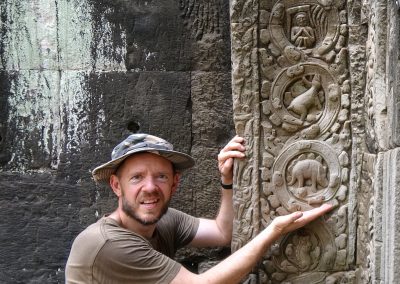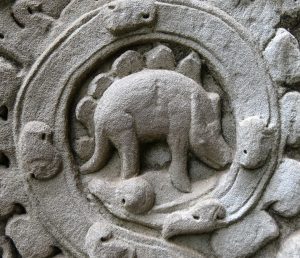 The plates along the back are probably the definitive characteristic of stegosaurs as we know them from the fossil record. But the prominent spikes at the tip of the tail are also a diagnostic characteristic. Cedar astutely notes that “some genera (such as Huayangosaurus and Tuojiangosaurus) actually possess more spikes than plates, why does this ‘stegosaur’ carving lack these characteristic features of stegosaurs?” This is a key point since it would be difficult for an observer not to recall this unique offensive weapon. But perhaps this detail was too small for the artist to bother with. In June of 2017 I traveled to the town of Siam Reap and visited Ta Prohm. I observed multiple elephant depictions (Figure 7) around the temple and noted that none of them displayed tusks. (Though, unlike African elephants, the female Asian elephants often lack prominent tusks.)