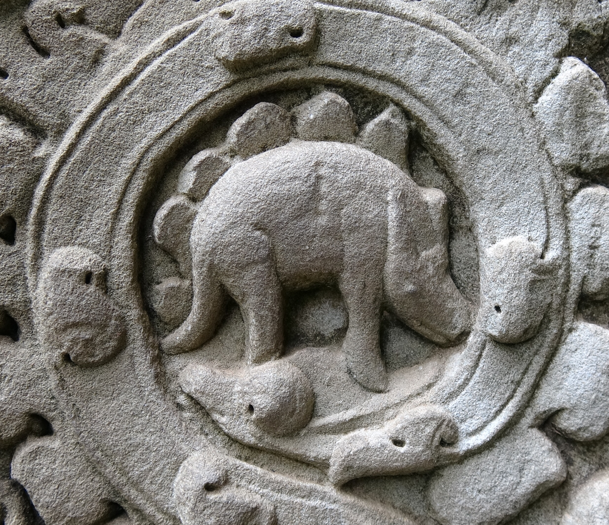 “It’s possible that the carving was based on a fossil stegosaur. Stegosaurids are known [sic] several areas of the world, including North America, Europe, Africa and East Asia. Although fossil finds are not frequent or plentiful in heavily vegetated areas like Cambodia, several stegosaur genera have been reported from the Jurassic of China (which once shared its southern boarder [sic] with the Khmer Empire). These include Huayangosaurus, Tuojiangosaurus, Chungkingosaurus, Chialingosaurus, and Wuerhosaurus” (Kuban 2014).