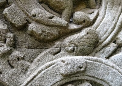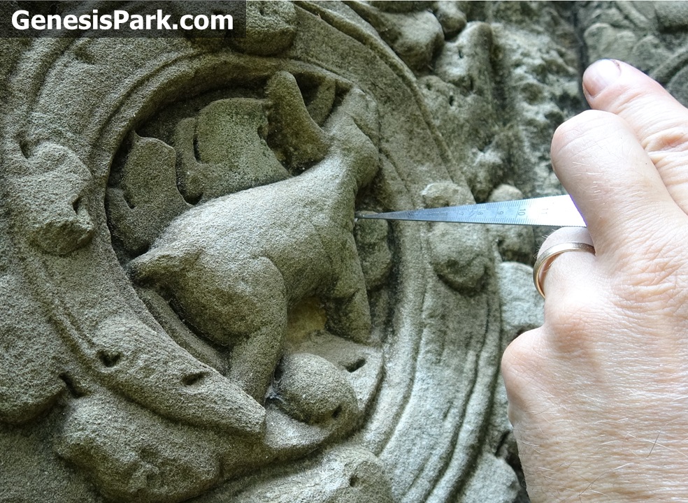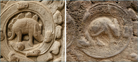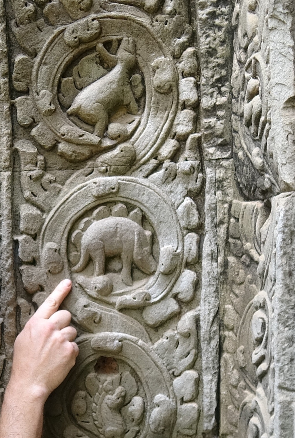 Interestingly, two of the better examples of leaf work inside the frame appear in the same column as the dinosaurian engraving (above and below it). Depth analysis of dozens of carvings around this temple consistently revealed relief of approximately 1 mm above the background for decorative flourishes. I was unable to find leaf work within a roundel that extended over 2 mm. Note the context animals on the same pillar as the dinosaurian frame. Other than the knobs that stick up at the feet of the stegosaur and water buffalo and on the left and right of the creature below the stegosaur, the background leaf work is quite flat and consistently low relief (Figures 9-11).