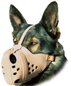 If the artist was able to model the plated body of a stegosaur so effectively, what about the oversized, blunt head and missing tail spikes? I think a clue to answering that question is the odd triangular shape coming up the side of the animal’s head with a bump or ring at the base of it. Is this merely a poor attempt to portray an ear? Probably not. It follows that the jawline and is unlike the ear of an elephant, hippo, boar, or rhino (all creatures that skeptics have presented as alternative identifications). Moreover, many upright mammalian ears are typically composed of sturdy cartilage that would stand up straight and not curve in, hanging against the upper body. Postulating that these are horns is even more problematic since they would be nearly useless on the sides of the head and curved tight to the body. I postulate that this engraving is a depiction of a captive stegosaur that has been muzzled, much as we would muzzle a dog today (Figure 15). Fitting such a muzzle over a plated stegosaur head and attaching it firmly to the back of the neck would require a large design. This explains both the oversized head and that odd device coming up the side. The large muzzle could double as a kind of bridle, an attachment place for reins. Other engraving at Ta Prohm show bridled horses and riders.