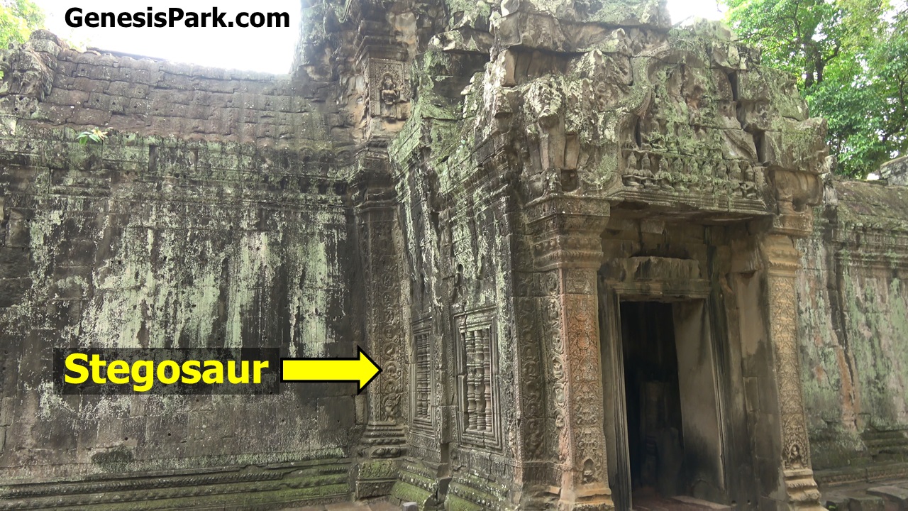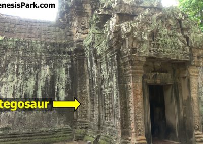 The Ta Prohm temple was constructed around A.D. 1200 to be a Buddhist monastery and university and it is large enough for thousands of people to have actively worked there. Ta Prohm’s traditional Khmer construction is made up of a series of gradually smaller enclosures. The outer one measures approximately 1 X .65 km. The inner structures contain columns and walls extensively engraved with humans, gods, animals and geometric figures. Larger scenes of Buddhist mythology were also incorporated. Among the site’s many animal depictions is a readily recognizable stegosaur-like carving on one column. Secular archaeologists have recognized the dinosaurian likeness (Freeman and Jacques 2009) and the stegosaur engraving has become a bit of an icon in creationist circles where it is used as evidence that men and dinosaurs coexisted (Cole 2007, Morris 2008, Isaacs 2010, Butt and Lyons 2008).