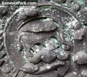 Halley points to large flowers carved on a column. He emphasizes the high relief of the plant’s distal edges, the pedals coming up towards the observer. But those flowers are artistic subjects. So, these examples only serve to buttress my point. When these protruding items are part of the subject (whether flower pedals or stegosaur plates), they stand out in high relief. When they are decorative background flourishes, they do not. Note also that the plates follow the contour of the animal’s back, from the neck to the tail. They are not coming from some central plant stalk in behind the animal as Halley suggests. One can see that the “petal” by the tail does not continue behind the animal, between the upper tail and the back leg.