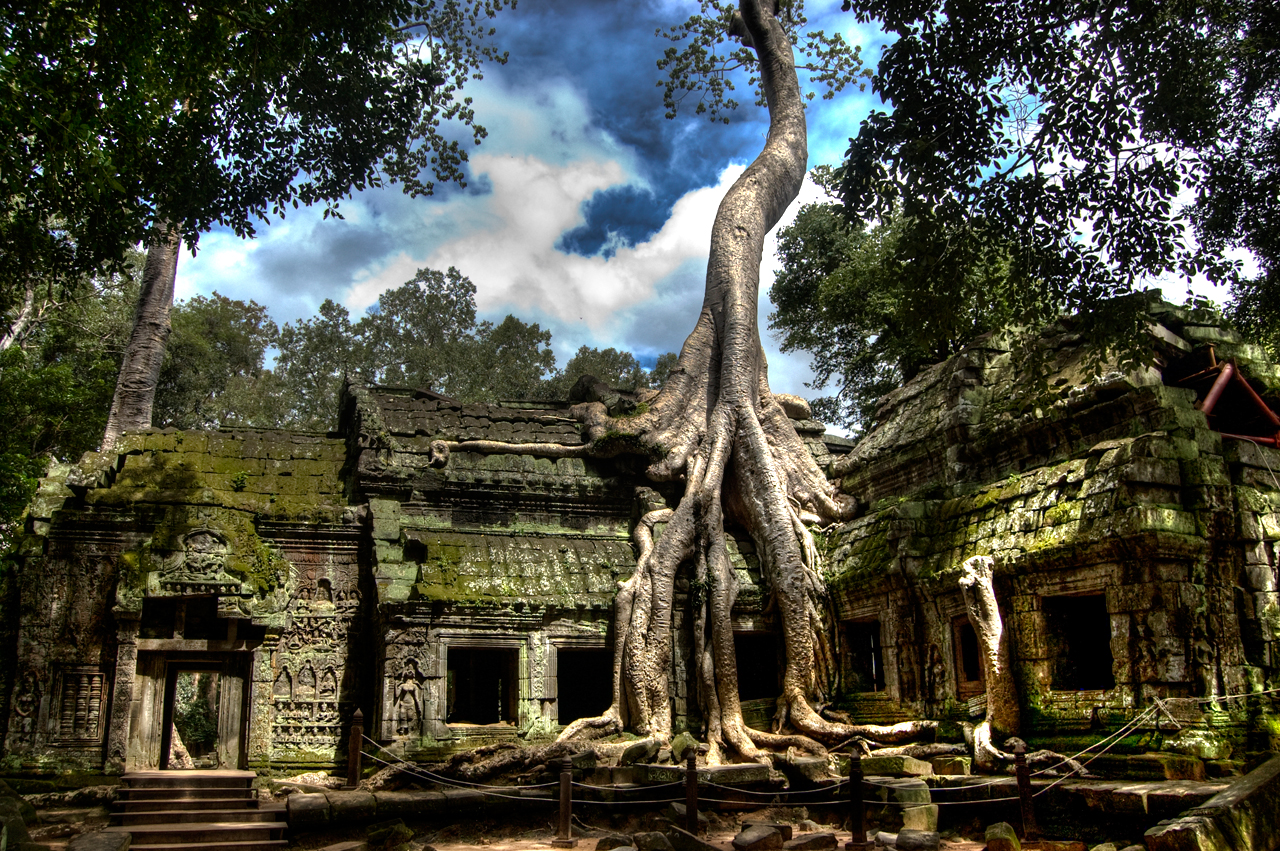 There are ruins of over 100 temples in the 400km2 Angkor Archaeological Park of western Cambodia. The most popular of these are the main Angkor temple (Fig. 2), Ta Prohm (Fig. 3), and the Bayon Temple. Not only is this site the world’s largest religious monument, but Angkor Wat was the most extensive urban complex in the pre-industrial world. Built between AD802 and 1431, it was the center of the mighty Khmer kingdom which ruled from the Chinese border over to the Indian subcontinent. Today, this sprawling temple complex in western Cambodia is an internationally famous World Heritage Site. With the fall of the Khmer empire during the 15th century, the temples were abandoned to the jungle until Angkor became the focus of historical research and restoration efforts in the last two centuries.