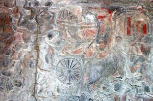 It is a matter of historical record that the Chinese sent numerous delegations to visit the Angkor Kingdom. One envoy at the time of the Chinese Emperor Timur Khan, Zhou Dauan, is particularly noteworthy. He came to Cambodia as part of a mission of Chinese nobles in 1296-1297 and stayed there to chronicle life in the Khmer capital. His records are the only written report of the Angkor Kingdom. As a Buddhist, Dauan took some interest in writing about the temples at Angkor (Daguan 2007). It would be expected that with this level of interaction (and religious synergy) some dragon stories and perhaps even drawings would have been brought to Angkor from China. In the west wing of the north chamber of the main Angkor Wat Temple is a relief of the god Agni riding a chariot that is pulled by a rhinoceros. (Figure 17 after Wikimedia) If the Khmer heard of dragons pulling carts in China, it is certainly plausible that they would depict such a dragon at Ta Prohm.
