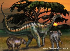 Some commentators have suggested that behemoth was a hippo or elephant. But the passage makes clear that this herbivorous animal was “chief of the ways of God.” Certainly the hippo and elephant (which had other Hebrew names) don’t qualify as the biggest land animal, nor does their anatomy fit the clear language of verse 17, which says, “he moves his tail like a cedar.” The cedar tree was the biggest and strongest trees in the region, used for constructing large projects and making weapons like clubs. The cedar analogy brings to mind a dinosaur’s huge tail!