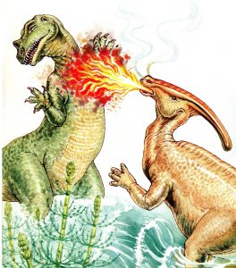 Lastly, there is some paleontological evidence that a skull arrangement might have accommodated “fire-breathing.” In his delightful book Dinosaurs by Design, Duane Gish discusses how the nasal cavity of the Parasaurolophus might have connected to chemical reserves in the hollow, horny crest. There are four separate passage in the crest, two running up from the nostrils and two running down toward the throat. At first, paleontologists thought this crest was used as a snorkel, but there is no opening at the end of it. Could it instead function like the abdomen of the beetle? The Old English word “neesings” in Job 41:18 denotes a voluntary sneeze. Perhaps Leviathan used this ability as a defensive weapon, just like the beetles. No wonder God uses him to make the point in verse 10 “None is so fierce that dare stir him up: who then is able to stand before me?” This helps us understand God’s purpose in creating such huge, fearsome reptilian monsters. We would be terrified to have a close encounter with them. Do we realize that we will have a close encounter with their Creator? Each of us will give an account to our God after we leave this world (Hebrews 9:27).