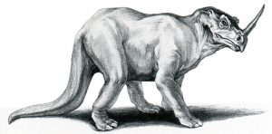 In 1981 Dr. Roy Mackal traveled to the Congo searching for the rumored sauropod dinosaur Mokele-mbembe. But he was surprised to hear reports of another mysterious animal called the Emela-ntouka or “killer of elephants.” The natives in the northwest region of the Likoula swamp told how it would gore elephants with its single horn. Mackal’s speculation that it was a ceratopsian dinosaur was cast in some doubt by the pygmies not recollecting a neck frill. The description, however, does not fit a rhinoceros which has a short tail and does not have a true horn composed of bone or ivory. It’s horn is composed of fused keratin (hair) and it seldom comes out the winner in a confrontation with elephants. Mackal left open the possibility that the Emela-ntouka was a still-surviving Centrosaurus. This member of the Ceratopsian family (sometimes called the Monoclonius) sports a single large horn on the center of its head as seen on left (Mackal, Roy, A Living Dinosaur, 1987, p. 236.). The ceratopsian identification has been strengthened by similar reports obtained by Genesis Park staff during a recent expedition to Cameroon (including some with a neck frill). It also matches the classical authors’ multiple references to a ferocious single-horned creature that spears elephants in the belly, and leaves them to bleed to death. Perhaps the neck frill is exclusive to the males or is a trait of a particular subspecies. The Centrosaurus may also be the same dinosaur as the Styracosaurus.