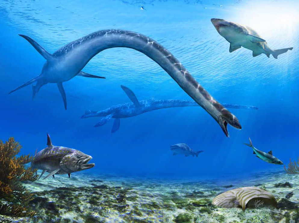 Although great swimming reptiles resemble the dinosaurs and are often discussed alongside them, they are not true dinosaurs (which are land-dwelling). Plesiosaurs grew to a size of 14 m (46 ft) and apparently used their flippers to “fly” through the water like a penguin. Although we have no absolute confirmation that plesiosaurs remain alive, enough evidence exists to suggest that some of these creatures (or similar sea monsters) still lurk in very deep lakes and in the sea!