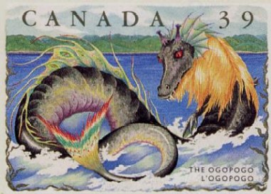 In 1989 Ogopogo was given protection under the Canadian Wildlife Act. A colorful stamp of the monster was produced by the Canadian government. The picture (above right) gracing the front of Arlene Gaal’s definitive Ogopogo book was drawn by Caleb Doubtfire and is based upon reports from the few witnesses that have actually seen the creature’s head. Since some of the recorded observations involve the humps of the creature coming clean out of the water (like a hoop), it would seem like Ogopogo is closer in form to a serpent than a plesiosaur. Possibly the creature is closely related to the Cadborosaurus (see the page on Other “Swimming Dragons”) that had made its way up the Columbia River from the ocean and ended up at Lake Okanagan.