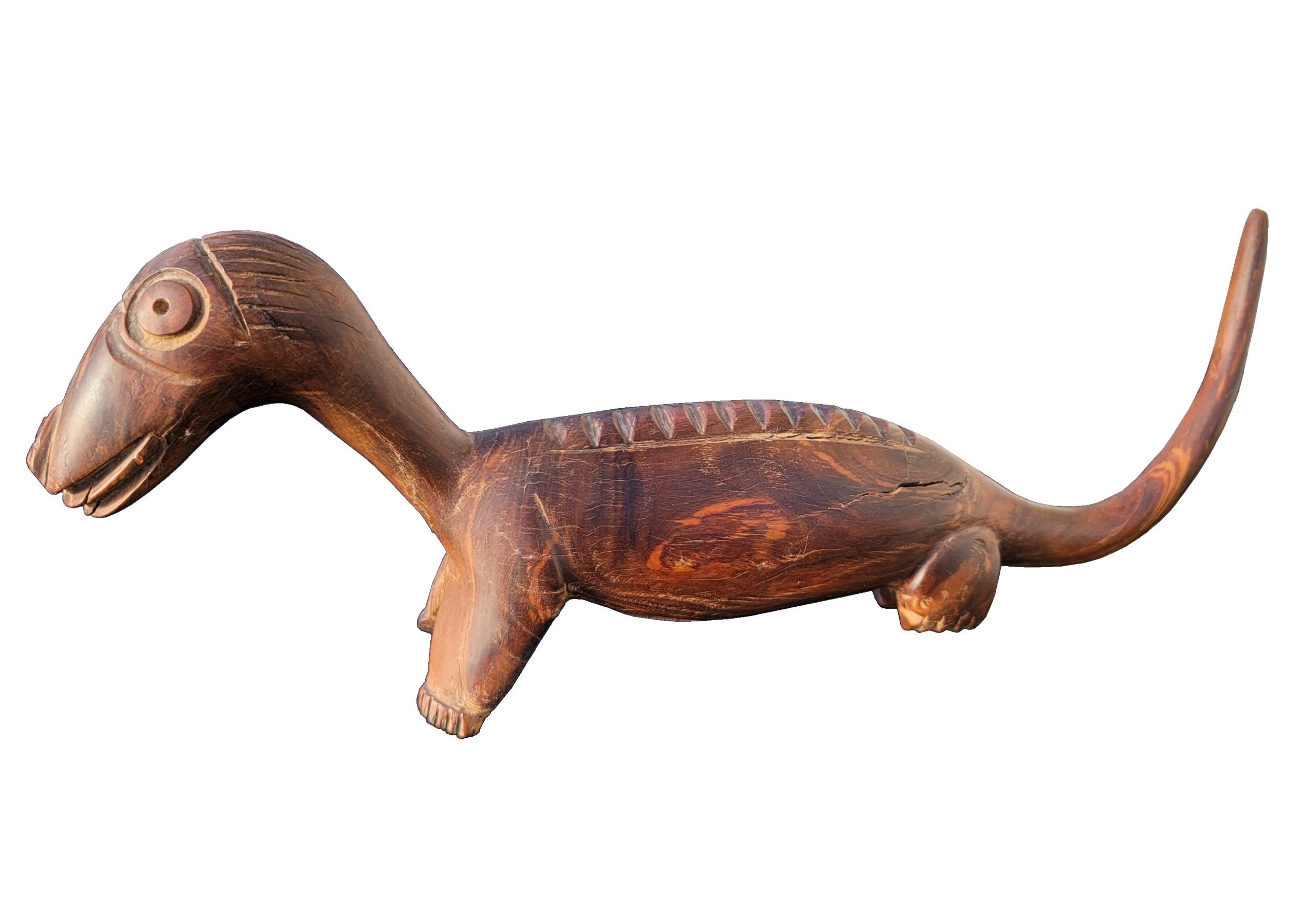 Below is a carving that showed up in a souvenir shop in the Congo in the 1980s. The indigenous artist was clearly trying to depict a long-necked, long-tailed animal. Notice that it seems to be herbivorous (no sharp teeth depicted). The stubby feet match up well with the appendages of a sauropod dinosaur, though the legs are quite short. It has a curious frill down the back, much like the spikes many paleontologists think sauropods like Diplodocus sported. There is no depiction of an ear, an accurate representation of a dinosaurian reptile. The piece is 15″ long and stands 6″ tall.