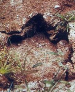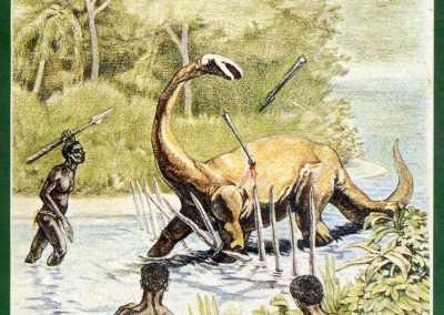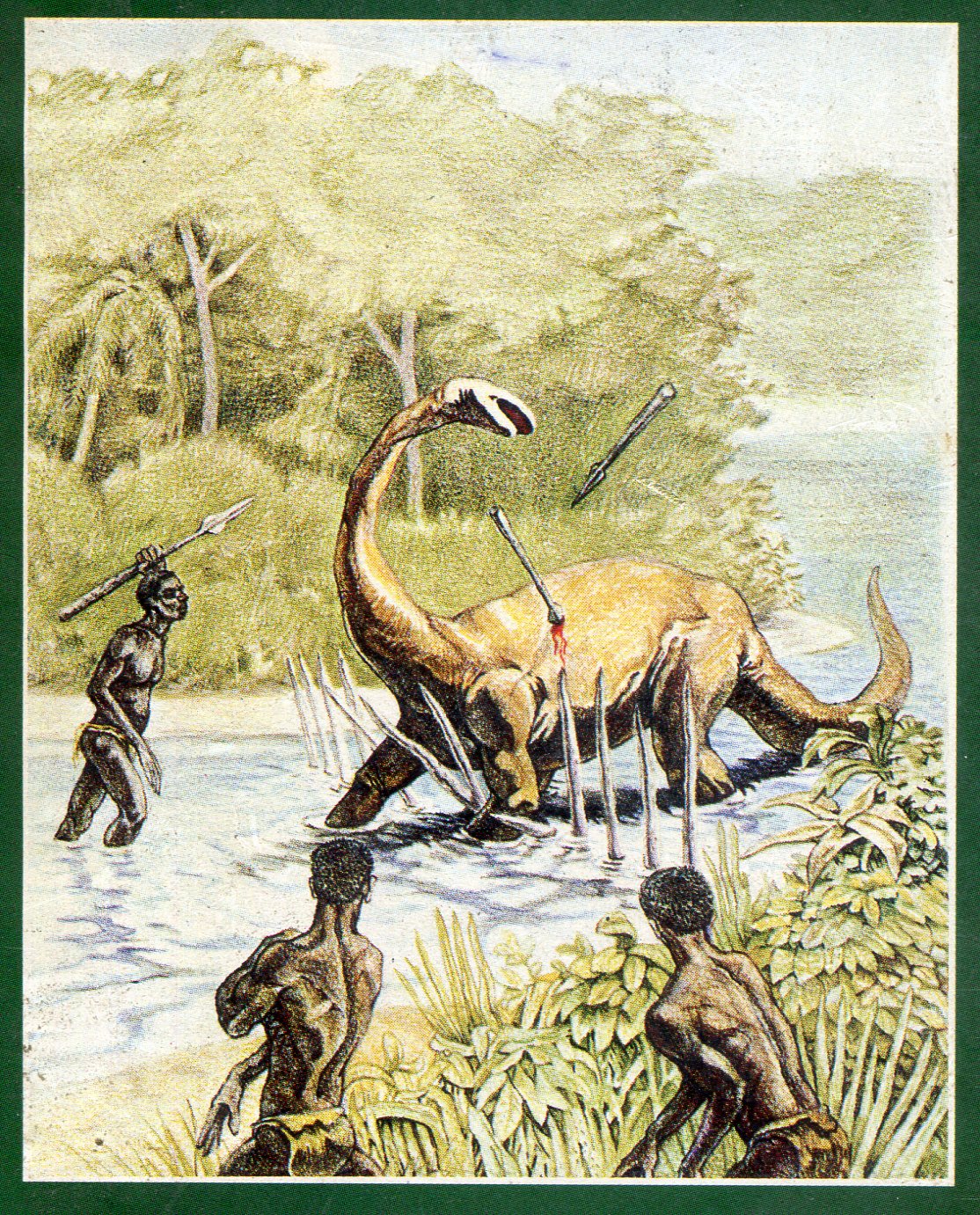 “In the swampy jungles of western Africa, reports persist of an elephant-sized creature with smooth, brownish-gray skin, a long, flexible neck, a very long tail as powerful as a crocodile’s, and three-clawed feet the size of frying pans. Over the past three centuries, native Pygmies and Western explorers have told how the animals feed on the nutlike fruit of a riverbank plant and keep to the deep pools and subsurface caves of waters in this largely unexplored region. After a recent expedition there, two American researchers conclude that these stories refer to a real animal, not a myth. Fantastic as it seems, Roy Mackal [University of Chicago] and James Powell believe that this creature, called ‘Mokele Mbembe’ by the natives, may actually be a dinosaur, perhaps one resembling brontosaurus, which is thought to have died out 70 million years ago.” (Anonymous, “Living Dinosaurs,” Science-80, vol. 1, November 1980, pp. 6-7.) Roy Mackal’s research regarding the Mokele-mbembe led him deep into the central swamps of the Congo. He returned with a numerous credible reports and a historic footprint photo (bottom left). Dr. Mackal wrote a book entitled Living Dinosaur? about his multiple trips and on page 225 he displays a picture of what he believes the creature looked like (above).