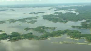 Lake Murray is the largest lake in Papua New Guinea (PNG), covering an area of about 700 sq. miles (though it shrinks and expands dramatically with the dry and rainy seasons). The lake’s serpentine shoreline creates many mysterious inlets and remote swampy coves. About 5,000 indigenous peoples inhabit this lake region in western PNG. Tribal villages dot the many small islands and lake shoreline, sporting houses on stilts and featuring dugout canoes as the main means of transportation.