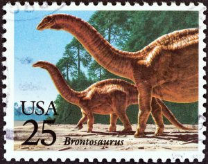As Americans found many exciting new kinds of dinosaurs in the west, two wealthy professors began a rivalry in the 1870s that has come to be known as “The Great Dinosaur Bone Wars.” Othniel Marsh of Yale University and Edward Cope of Haverford College both fielded fossil-hunting teams, racing desperately to find new fossil beds to name the next dinosaur. In their hurry to name what appeared to be a large new dinosaur, Marsh’s team placed the wrong head on a specimen and gave it the name “Brontosaurus.” When it became clear that the head belonged to Camarasaurus and that the body was the same as the Apatosaurus skeleton that had been found earlier, the name Brontosaurus was dropped. However, the name continues on in popular usage, as is demonstrated by the 1989 US Postal Service stamp to the left.