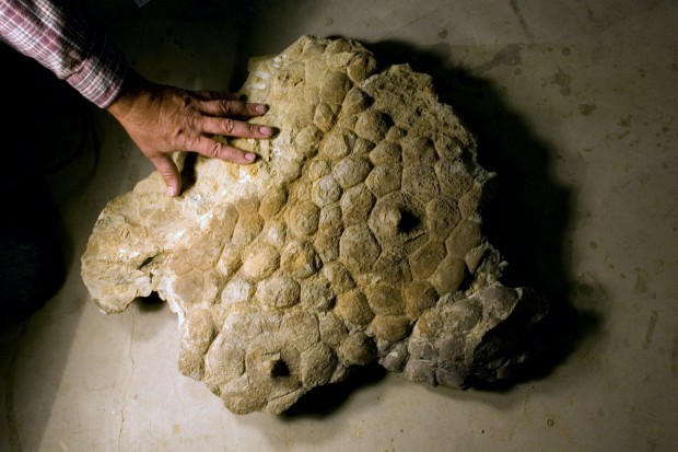 Next up is wonderfully preserved dinosaur skin from a fossil Triceratops named Lane (photo by the Black Hills Institute). Amidst the scales are large protruding bumps, or rosettes, that match up well against some of the historical depictions of dinosaurs engraved on the Ica Stones. While these fossils typically still leave a lot of unanswered questions (like what colors the dinosaur was), they can give valuable clues to the general appearance and physiology of the great reptiles. For example, the evidence of fluffy hairs on some pterosaur fossils led to artistic revisions and provided further evidence that they were warm-blooded.