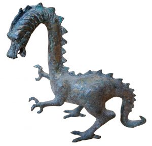 To the right is a bronze Persian pot manufactured toward the end of the 1st Millennium AD that is part of the Genesis Park collection. The most fascinating element of this vessel is the stylized, scaled dinosaur-like dragon that forms the spout. Dragons form an integral part of Persian mythology and beliefs. The ceremonial undertones of this vessel lead us to believe that it was associated with Zoroastrianism. Several malevolent dragon-like creatures are mentioned at various points in the Zoroastrian scriptures. One such popular dragon myth involves Azi Dahaka – a three-headed Persian dragon that will devour one third of all men and animals at the end of the world.