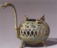 Next we consider some Asian incense burners. To the left is an ancient Thai incense burner pictured in the book Arts of Asia : Materials, Techniques, Styles by Meher McArthur. Curiously enough, it looks like a stylized version of a sauropod, the fossilized bones of which were actually found in Thailand. Notice the birds perched on the back of the dragon, much as we see them do today on the back of a hippo. A similar motif is seen in a Viet incense burner to the right. This cast bronze work is dated to the 3rd century A.D. and is from the Dongson culture. The piece is housed at the Boston Museum of Fine Arts.