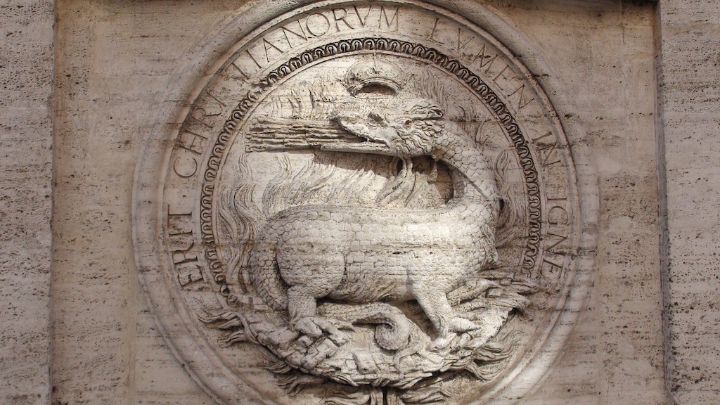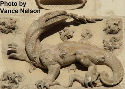 In Rome there is similar artwork on the outside at the Church of St. Louis of the French. This served for many years as the national church of France in Rome and was completed in the 1580s. Notice on the dragon artwork the long neck, tridactyl feet, long tail, neck frill, the scales, and especially the dinosaurian-looking legs. They drop down straight, rather than being splayed out parallel to the ground like a salamander or lizard’s legs. Though exposed to the elements on the exterior of the church, the detailed work has been remarkably well preserved over nearly five centuries! Click to enlarge this amazing dragon carving.