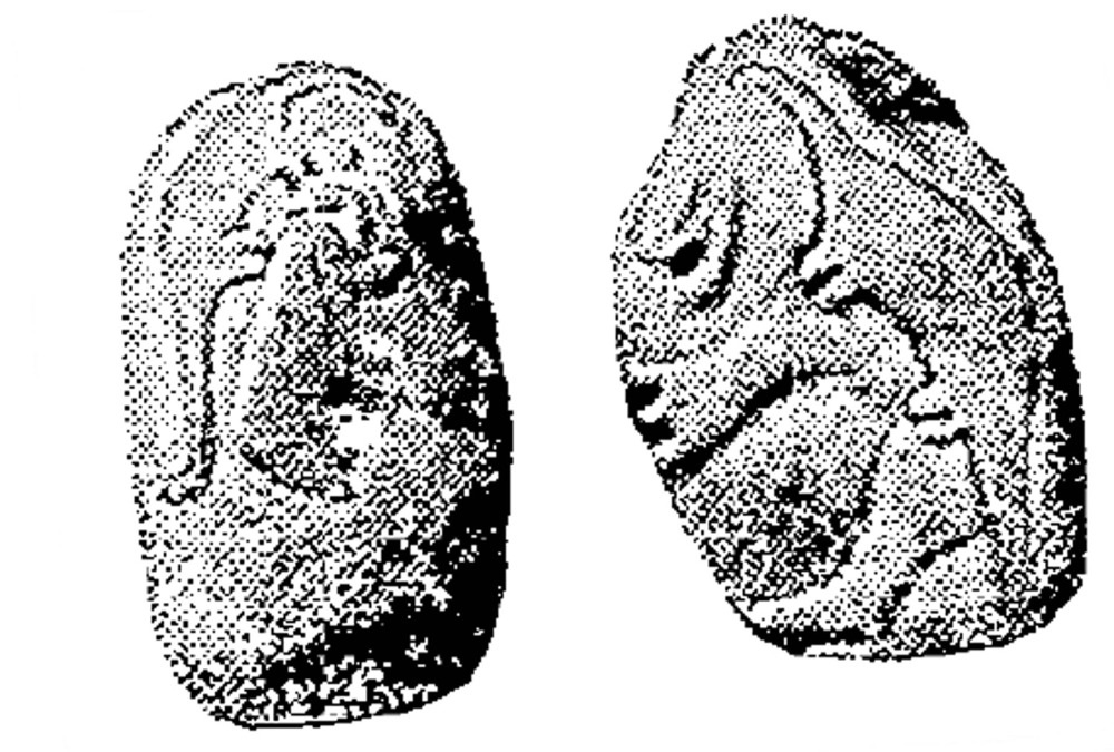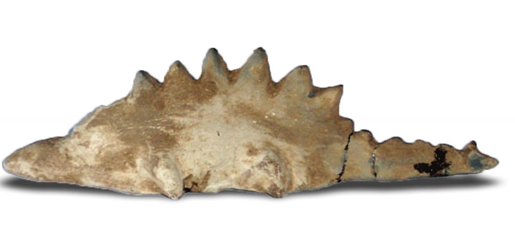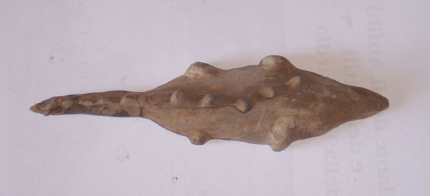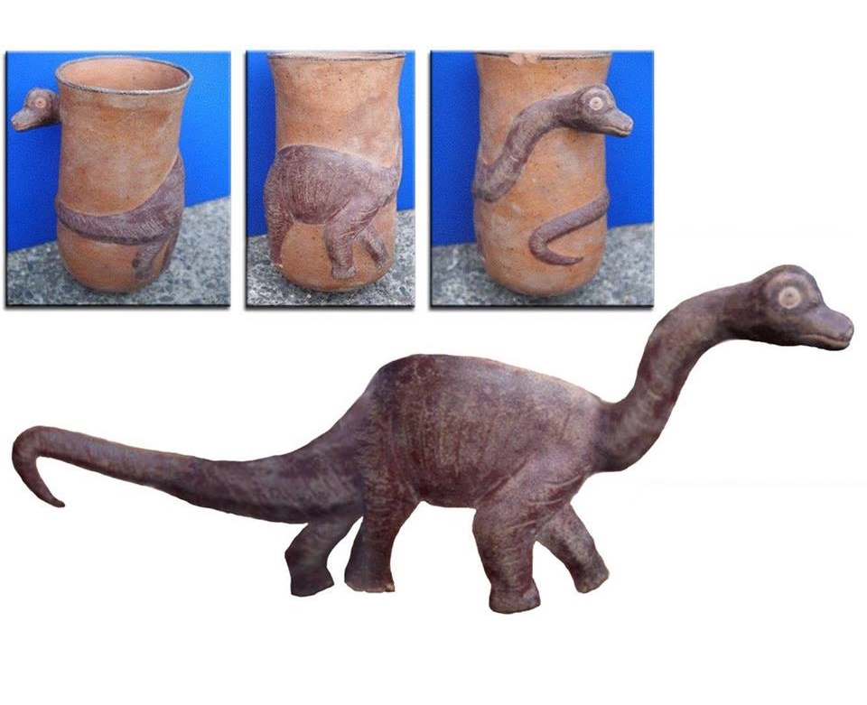 A 1971 landslide in the Girifalco region of southern Italy brought to light hundreds of ancient artifacts of a pre-Greek civilization. A lawyer named Mario Tolone Azzariti asserts that he found some dinosaurian representations among them (pictured below). Below is a terracotta ceramic statue measuring about 18 cm long, shaped remarkably like a Stegosaurus dinosaur. The triangular plates run down its back to the creature’s tail. In the view from above the object reveals a strange curving of the plates, as if the animal had been represented lumbering from side to side. The legs are large and awkward, as if carrying great weight, not at all like those of a lizard. There is also what appears to be a Stegosaurus on a piece of broken pottery. Notice the similarity in the two art pieces, especially the peculiarly small legs.