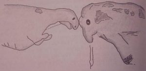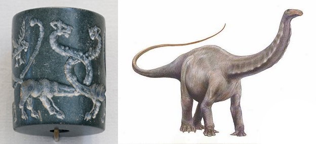 The artifact below is a Mesopotamian jasper cylinder seal from the Uruk Period (about 3500 BC). This object is currently housed at the Louvre. The animal on the right is an artist’s conception of an Apatosaurus. There are many striking similarities between these two depictions. The long neck, tail, legs and feet on the artifact clearly fit the sauropods better than any other type of animal. The biggest difference is at the head. Cartilage forming the shape of a frill or ears may be stylized or accurate (since there is no way to know from the skeletons we have today). As for the musculature, the ancient artist draws with stunning realism. One has to ask where the artist got the model to draw so convincingly the trunk and long tail of a sauropod.