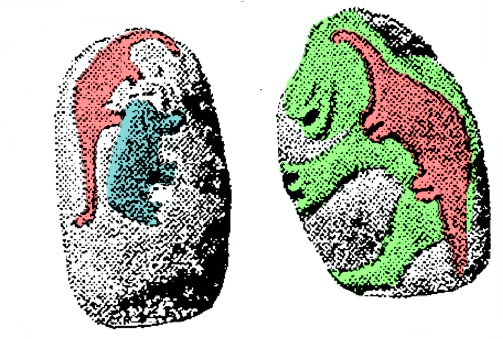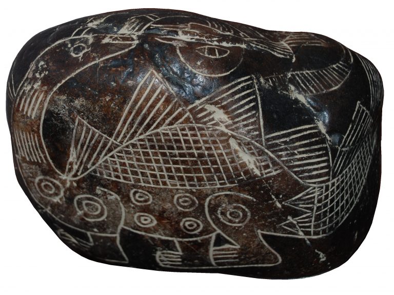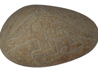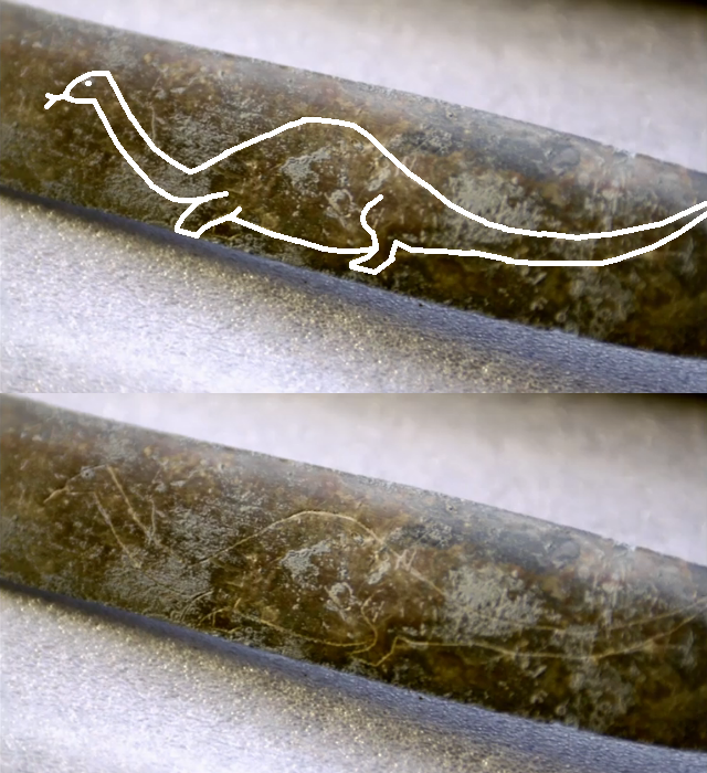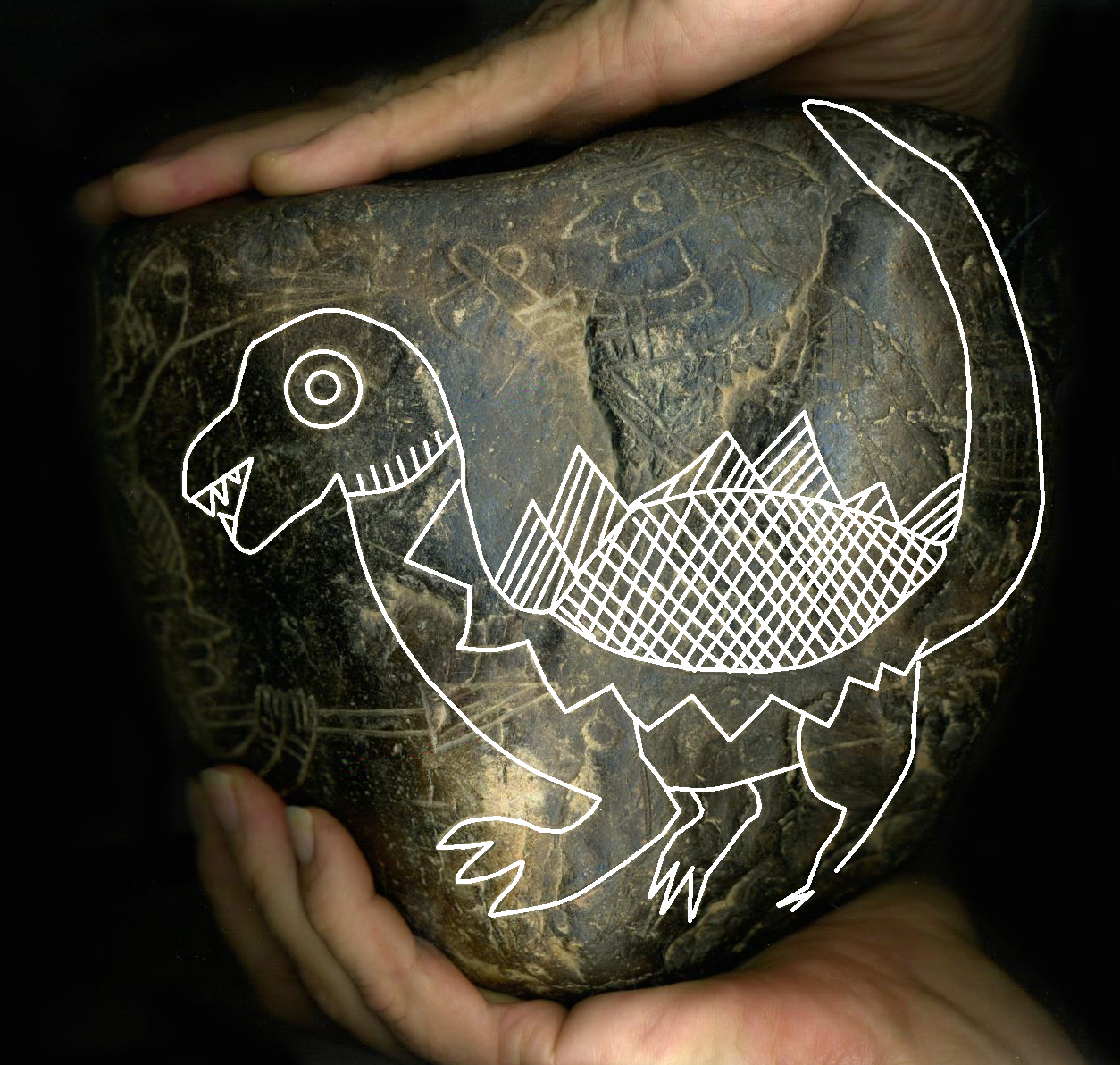 Many of the Ica Stones were been blackened so that the artistic etchings stand out. Undoubtedly, many fraudulent Ica Stones have been manufactured over the years to sell to tourists. But microscopic analysis of the patina (covering the stone surface), copper traces and oxidation in the etching grooves helps distinguish between the authentic and the recently forged artifacts. In 2015-2016 Genesis Park participated in research seeking a methodology to independently authenticate the Ica Stones. This resulted in an article published in a peer-reviewed creation science journal. The Paracas Stone with the dinosaur outlined (above) was one of those authenticated Ica Stones.
