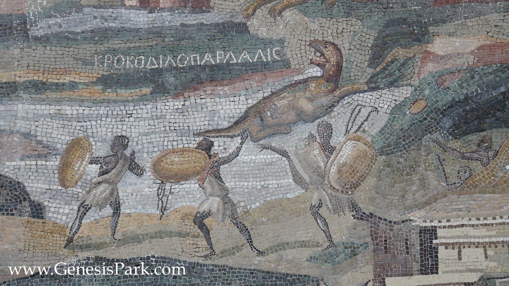 Next up is a beautiful mosaic that was one of the wonders of the second century world. It is called the The Nile Mosaic of Palestrina as it is housed in Palestrina, which is just south of Rome. This masterpiece depicts Nile scenes from Egypt all the way up into Ethiopia. Scholars now believe this is the work of Demetrius the Topographer, an artist from Alexandria who came to work in Rome. Perhaps it was commissioned to celebrate Rome’s conquest of Egypt. The top portion of this remarkable piece of art is generally believed to depict African animals being hunted by black-skinned warriors. These Ethiopians are pursuing what appears to be some type of dinosaur. The Greek Letters above the reptilian animal in question are KROKODILOPARDALIS, which is literally translated Crocodile-Leopard (apparently identifying an agile reptilian creature that moved like a leopard). The picture shown here is only a small portion of the massive mosaic. It also contains clear depictions of known animals, including Egyptian crocodiles and hippos.