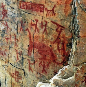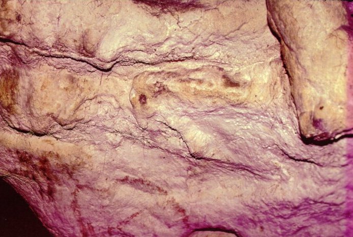 Our gallery of ancient artwork resembling dinosaurian creatures begins with a picture drawn on the walls of a cave in France. Bernifal Cave is one of the caverns in France that is known for Neanderthal cave art. Here is a depiction of what appears to be a bipedal dinosaur with small forearms. The creature is shown in head-to-head combat with an apparent woolly mammoth. This photo is from the