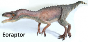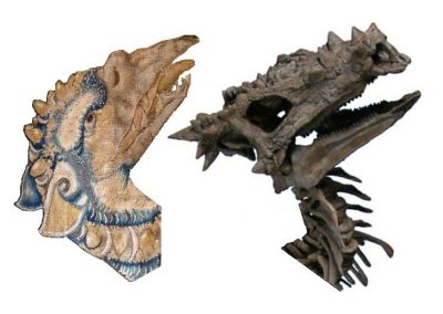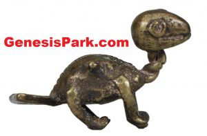 Another bronze Han Dynasty piece (dated from 206 BC – 220 AD) is seen to the right. The original is displayed at China’s Changzhou Museum. The posture, dermal frill, and number of toes fits that of a small theropod like Eoraptor or Gallimimus. If this is not modeled after a dinosaur, what animal would have given the Han artist the idea for this long neck, long tail, dermal spines, and upright posture? Even the let proportions (front and rear) are accurate.