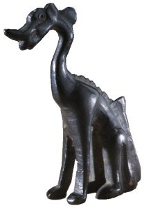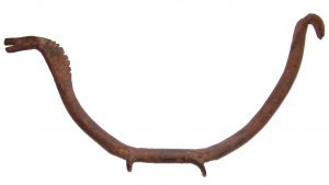 The Bambara peoples of Mali Africa created wonderful wood and iron figurines in the 1800s. Humans, horses, antelopes, and much more are beautifully portrayed. To the right is an iron figure that was entitled “dinosaurian sculpture” by the auctioning gallery. It shows a four-legged creature with long neck and tail like a sauropod dinosaur. The neck has a slight widening and a ridged frill that makes it an especially fascinating depiction. The iron piece is actually a functional tool, with a hook at the end, perhaps used to retrieve a hot pot off the fire.