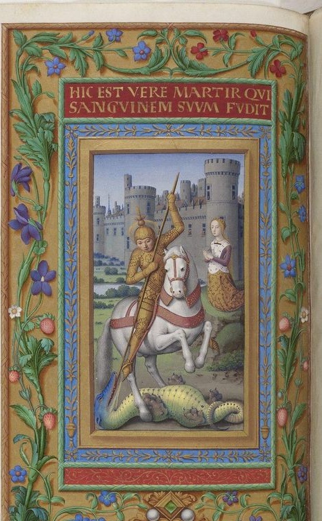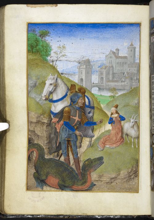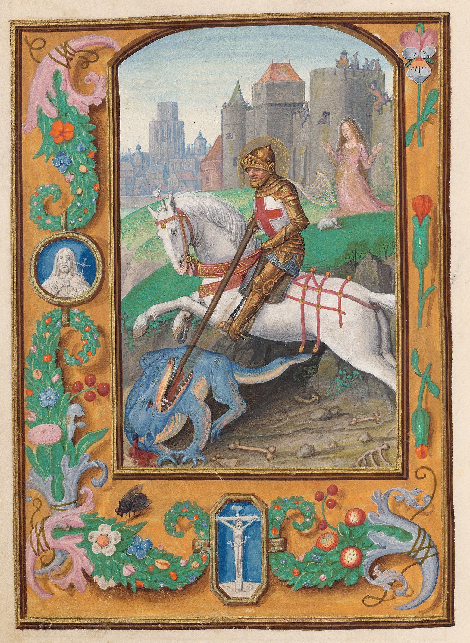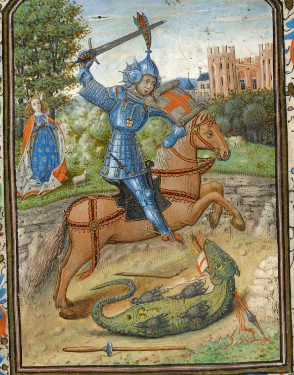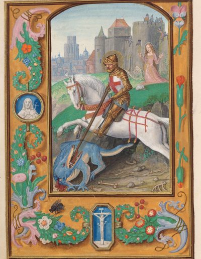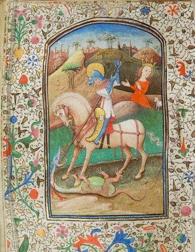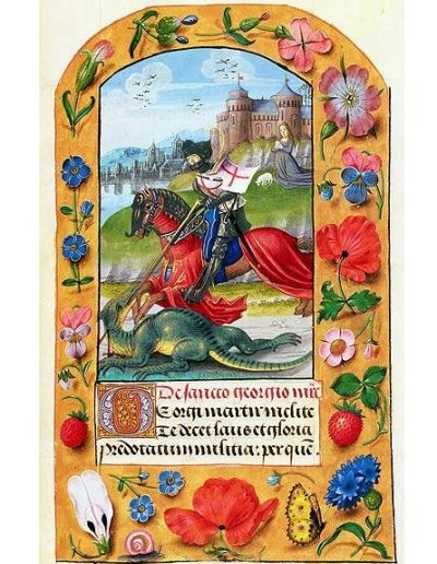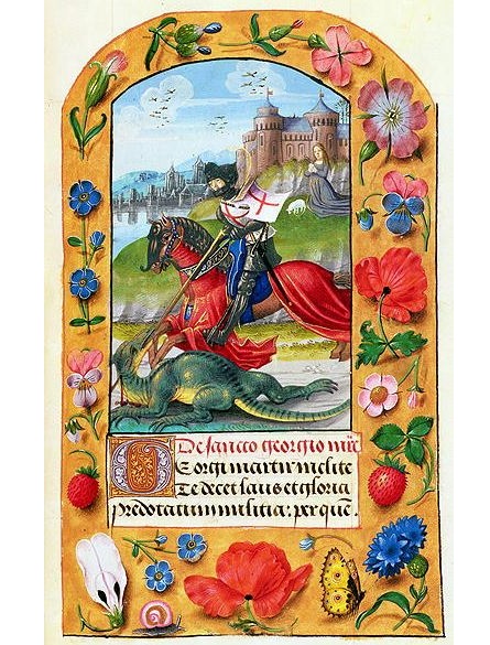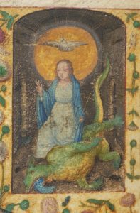 Another popular Medieval dragon legend involves Saint Margaret of Antioch. Stories of this young Christian martyr vary. Supposedly she lived in the 4th century AD and encountered extensive persecution for becoming a Christian. At one point, she was even attacked by a dragon, which swallowed her whole. But as she began to pray inside the reptile, the cross she wore around her neck cut into the stomach of the reptile sufficiently that she was able to pop back outside, killing the dragon. Various artistic images of this event reflect the local conceptions of dragons. Notice the dinosaurian features (right) in this illustration by a Belgian artist for a Book of Hours that is currently in New York’s Morgan Museum.