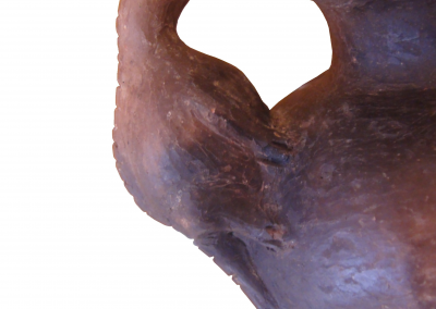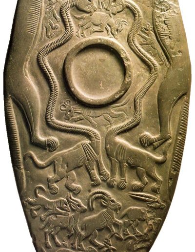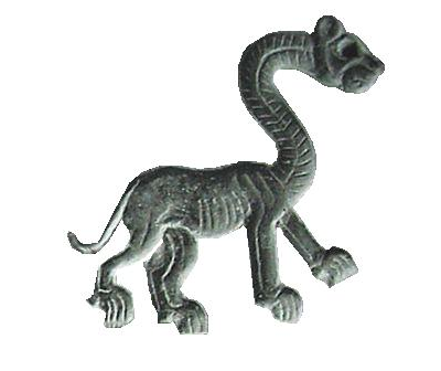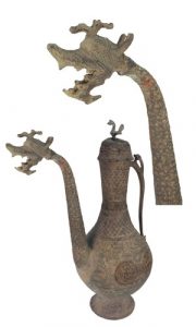 To the right is a bronze Persian pot manufactured toward the end of the 1st Millennium AD that is part of the Genesis Park collection. The most fascinating element of this vessel is the stylized, scaled dinosaur-like dragon that forms the spout. Dragons form an integral part of Persian mythology and beliefs. The ceremonial undertones of this vessel lead us to believe that it was associated with Zoroastrianism. Several malevolent dragon-like creatures are mentioned at various points in the Zoroastrian scriptures. One such popular dragon myth involves Azi Dahaka – a three-headed Persian dragon that will devour one third of all men and animals at the end of the world.