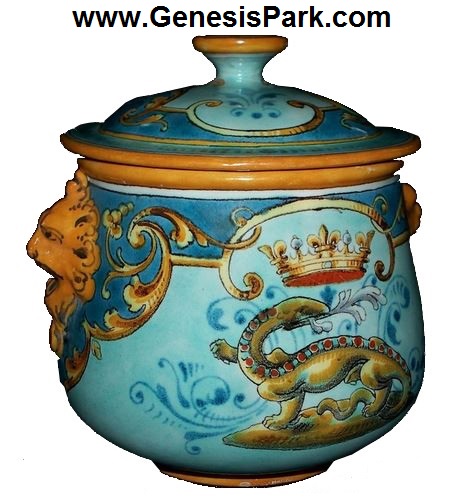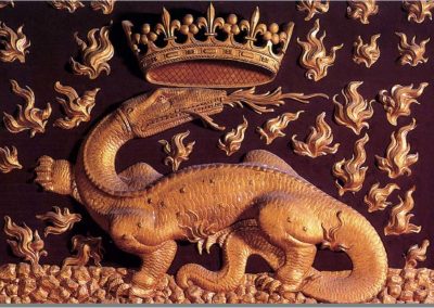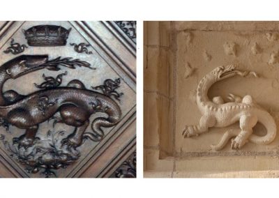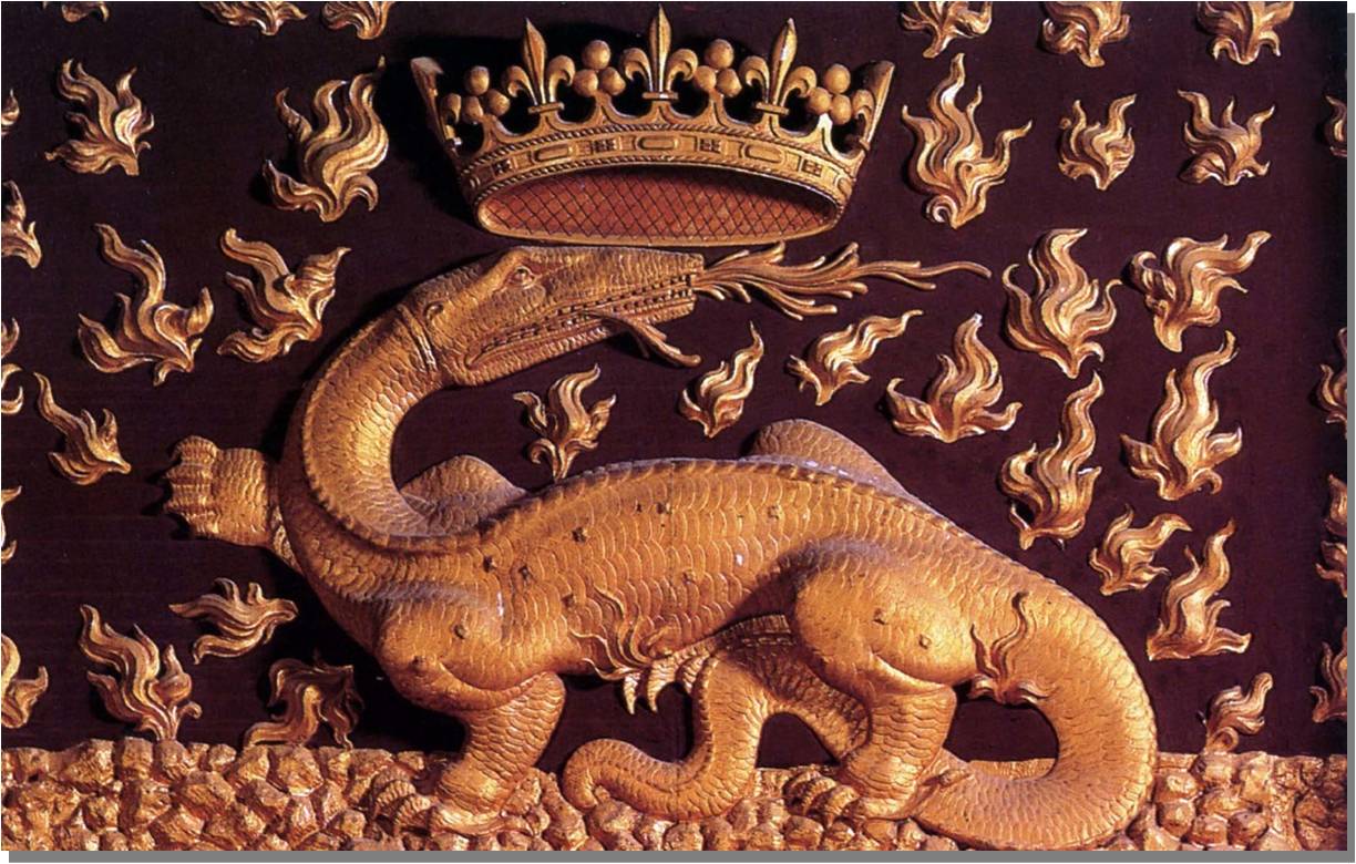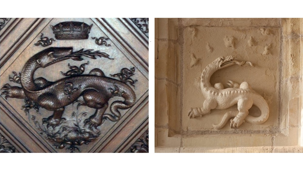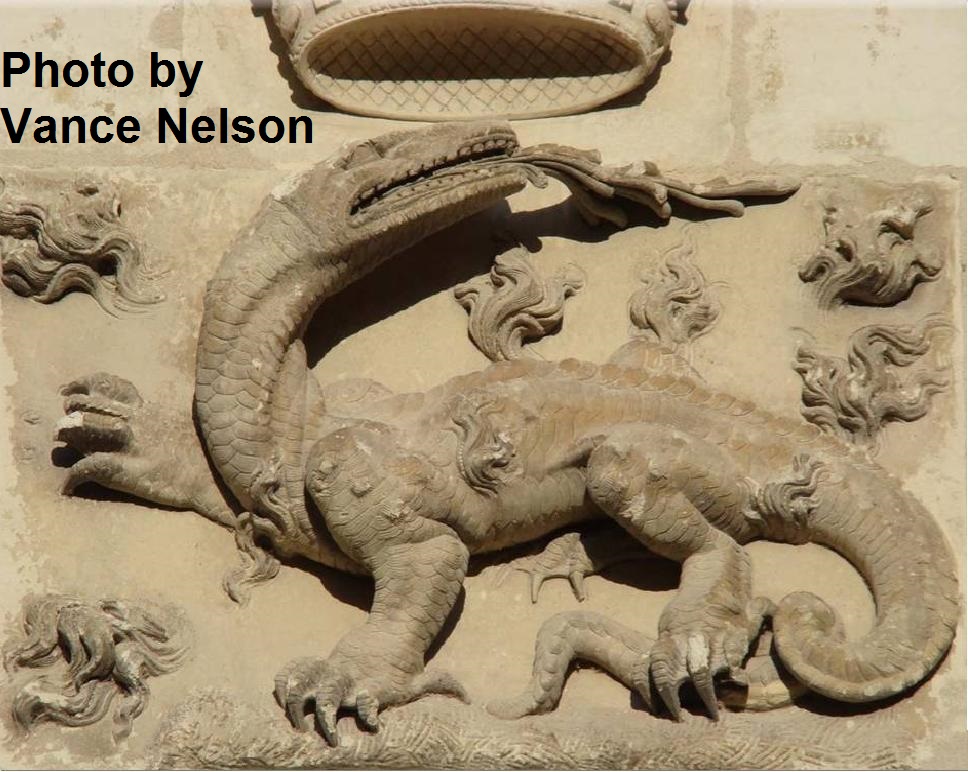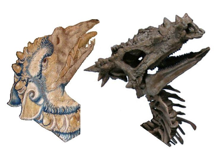Some of the beautiful French chateaus built at the close of the Middle Ages and early 1500s have dramatic dragon illustrations carved into their walls, ceilings, and furniture. These include Château de Chambord, Château de Blois, and Château Azay-le-Rideau. Called “salamanders,” based on a legendary salamander that could survive fire, they became especially popular decorative elements on construction during the reign of Francis I. Often they are portrayed actually as a fire-breathing dragon, like the biblical Leviathan. A number of features make these “salamanders” different from the amphibians we know by that name today. They are depicted with long necks, scales, prominent teeth, powerful claws, and an upright posture. The form is much closer to the reptilian dragon depictions common in European art from that period. Note the similarities among these “salamander” dragons below and their resemblance to dinosaurs like Thecodontosaurus, Plateosaurus or Baryonyx (whose fossils are found in multiple locations around Europe). A number of royal household furnishings from that time also depict a similar dragon, like the antique French pot (above right). A tapestry at Château de Blois portrays a dragon (and its baby) with gnarly horns on its head that are reminiscent of the dinosaur Dracorex hogwartsia (photo credit: Don Patton).