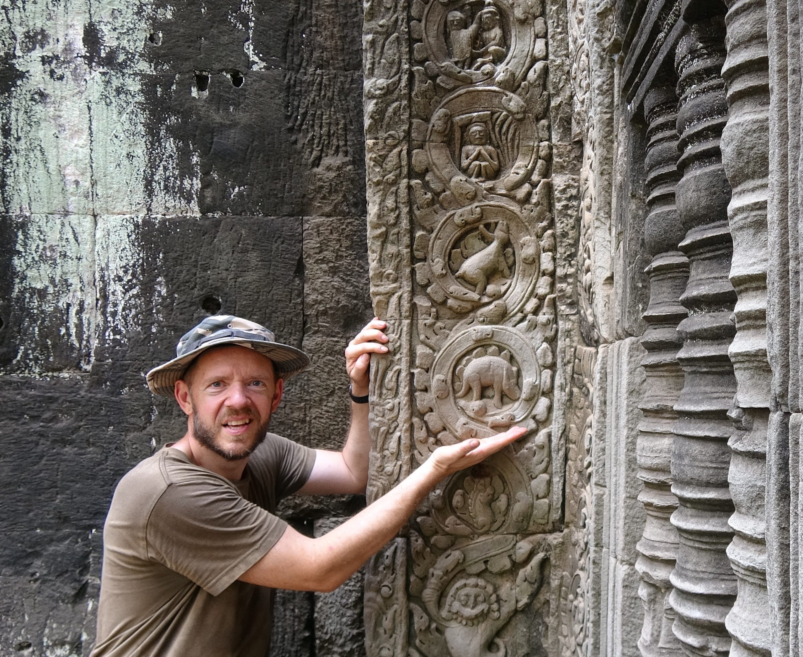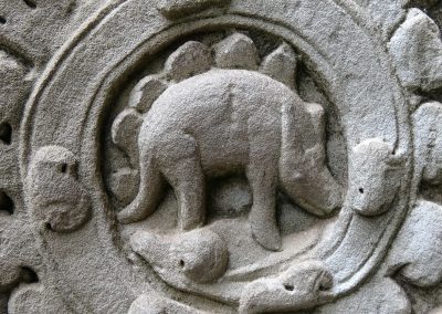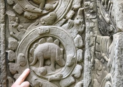 Deep in the jungles of Cambodia are ornate temples and palaces from the Khmer civilization. One such temple, Ta Prohm, abounds with stone statues and relief art. Almost every square inch of the gray sandstone is covered with detailed carvings. These depict familiar animals like monkeys, deer, horses, elephants, water buffalo, parrots, and lizards. However, one column contains an intricate carving of a stegosaur-like creature (below). Note the upright posture, huge tail, and plates. But how could artisans decorating an 800 year old Buddhist temple know what a dinosaur looked like when western science only began assembling dinosaurs skeletons in the past two centuries? It seems that the Khmer artist had seen or received reports of a stegosaur. However, skeptics point to the lack of tail spikes and the over-sized head to question the stegosaur interpretation. After traveling to Ta Prohm in 2017, taking hi-res photos and measurements, and discovering a second stegosaur engraving, Genes Park staff prepared a peer-reviewed journal article on “The Stegosaur Engravings at Ta Prohm” responding to the critics.