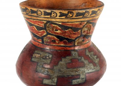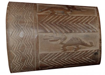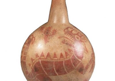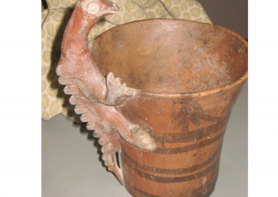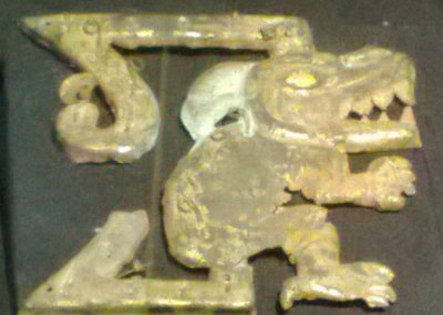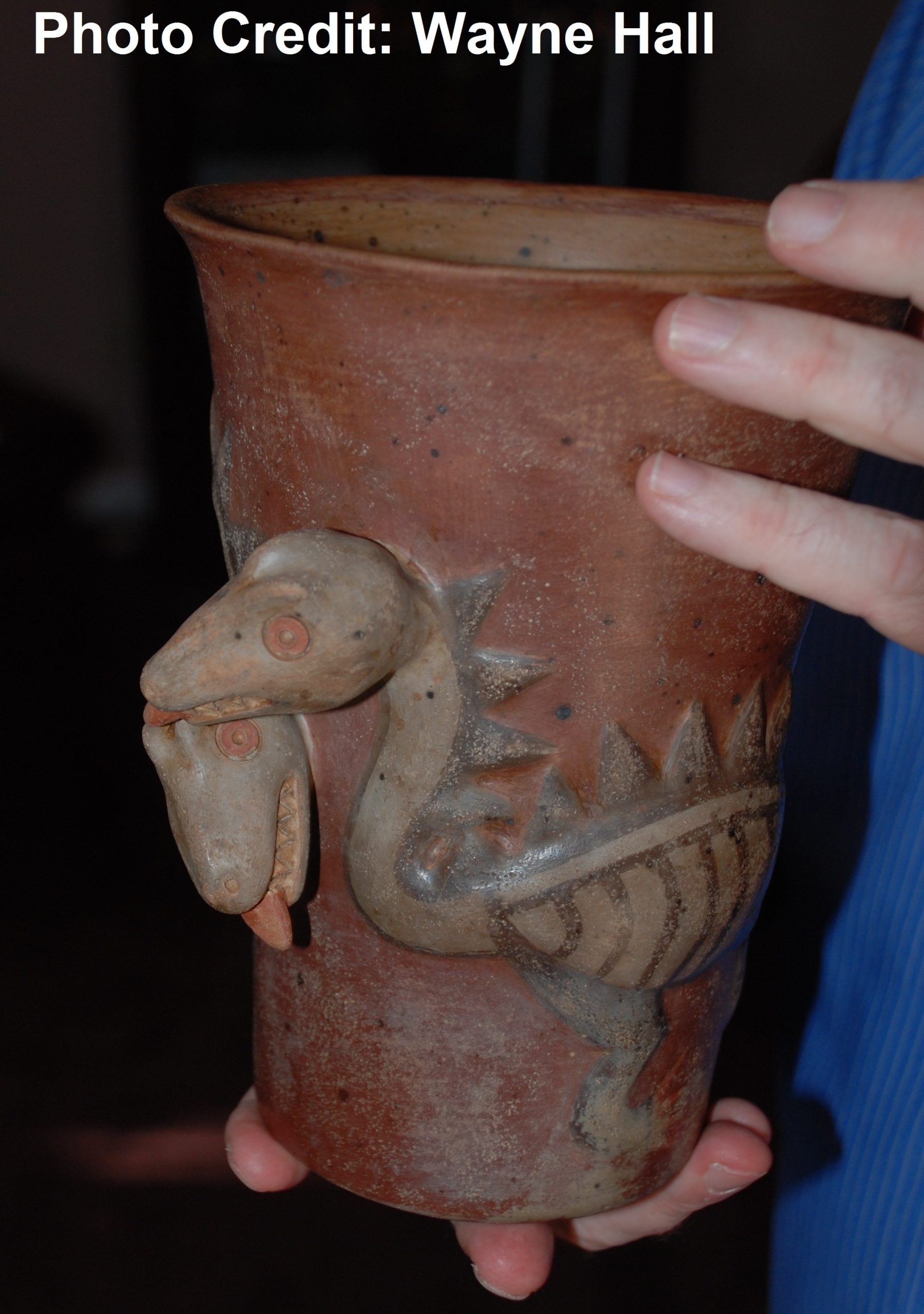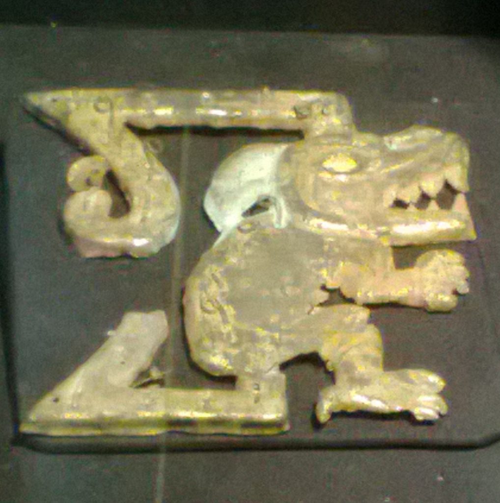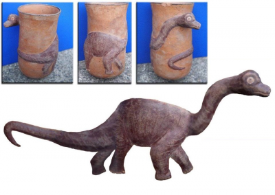 Next is an artifact from Tiwanaku, an important Pre-Columbian archaeological site in Bolivia. Tiwanaku is recognized by Andean scholars as one of the most important precursors to the Inca Empire. The vase appears to depicts “dueling dinosaurs” and is believed to date from 500 – 1000 A.D. The style closely resembles the Nasca dinosaurian depictions (on the Ica Stones).