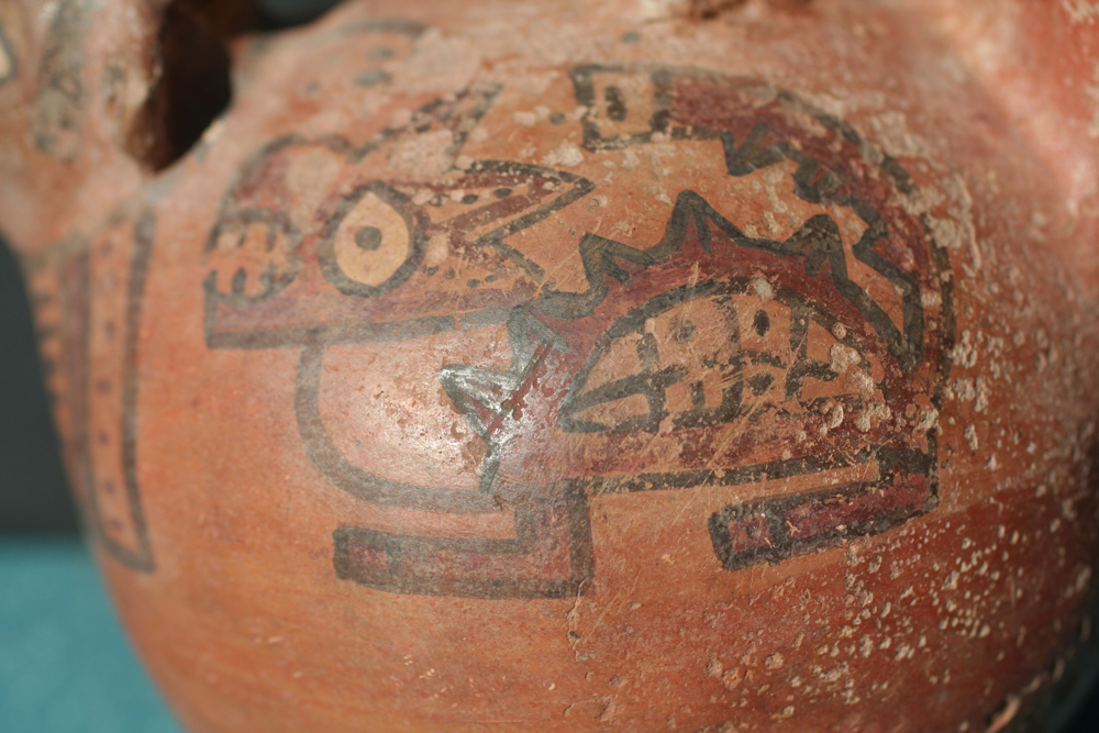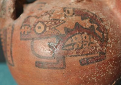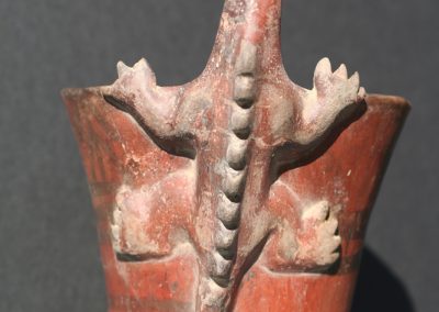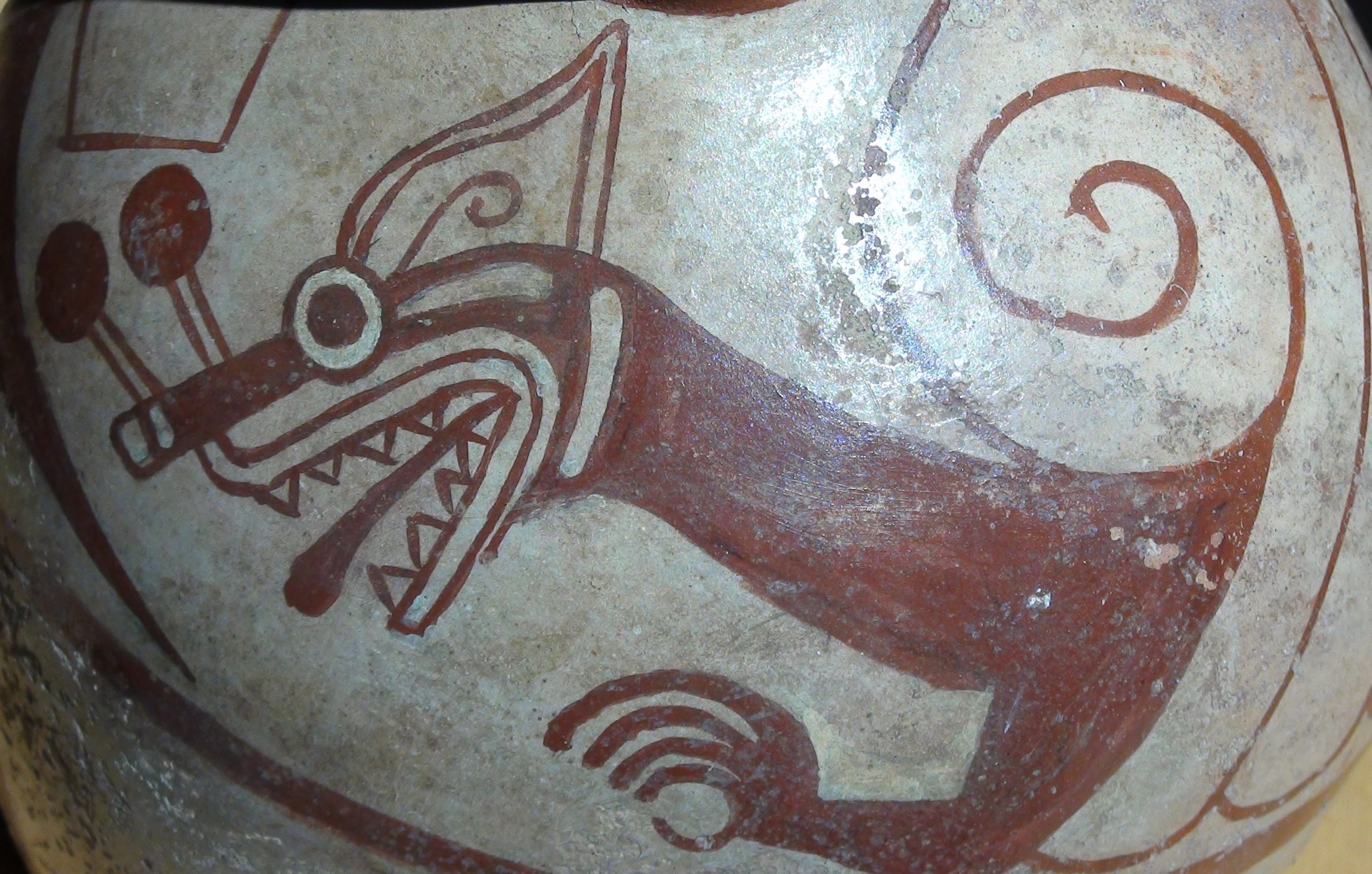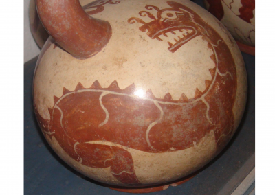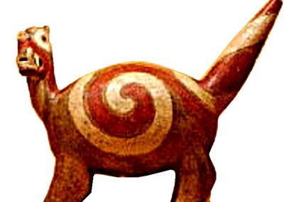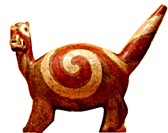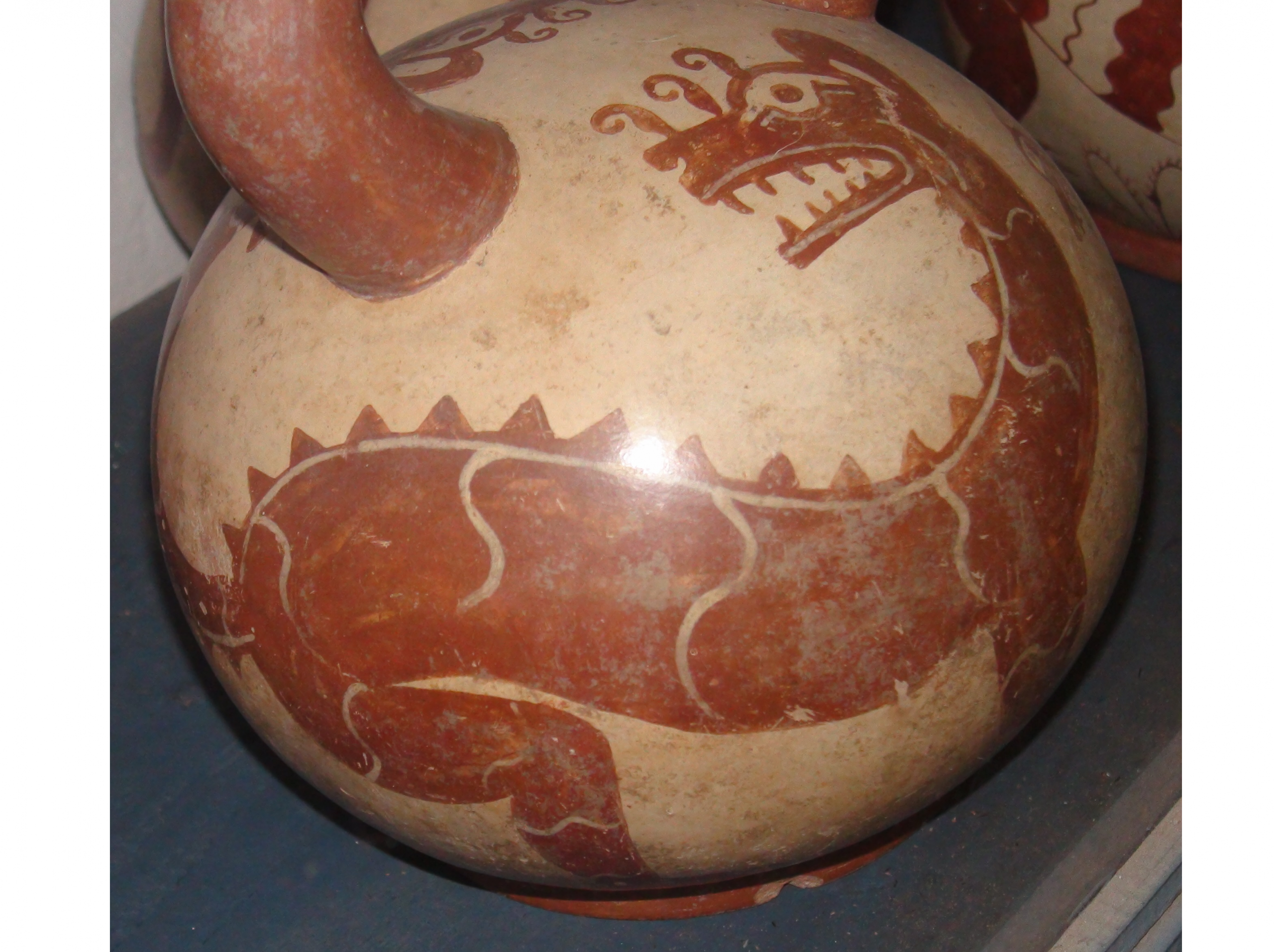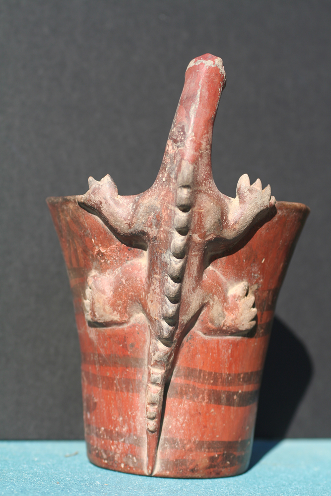Not far from the South American Nasca sites are the Moche Indian archaeological locations. These Moche tribes inhabited northern Peru about 100-800 AD. Among the artifacts currently in the Lima museums are the Moche stirrup-spout pots (above). These are their main artistic medium, featuring red & white ceramic pots displaying realistic medical procedures, combative events, musical instruments, plants and animals. Official guides at Peru’s numerous museums and archaeological sites will tell you that the native cultures depicted only things that they saw in nature. So what inspired a dragon-like images like shown on the Moche canchero? In Lima’s Larco Museum there are numerous ancient vases that quite clearly depict long-necked reptilian monsters with three or four toes, in some cases carrying a trophy head on their tail. These creatures bear a resemblance to those shown on the Ica stones, including the dermal frills. They have been dubbed “Strombus Monsters” because they are sometimes shown hiding in a Strombus shell (note the Moche pot in the center). Both this piece and the canchero are part of the Genesis Park collection.