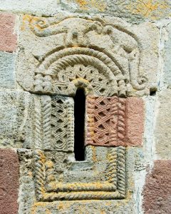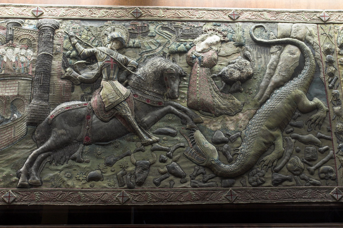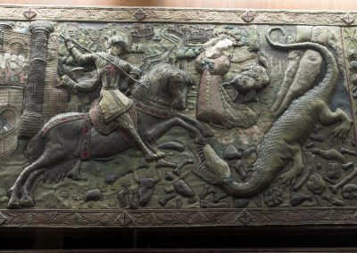 The country of Georgia sits at the edge of Eastern Europe and Western Asia. High in the hills atop Mount Gergeti is the Holy Trinity Church (also known as Tsminda Sameba) which was originally constructed in the 1300s. The bell tower window contains some unusual carvings that look quite a bit like two dinosaurs, perhaps engaged in head-butting combat. Inside the church is an ancient icon of St. George slaying a snake-like dragon. St. George has been revered in the Republic of Georgia since the 4th century. The weathering and patina of these dragons certainly seems to match the rest of the construction, suggesting it is an original carving.