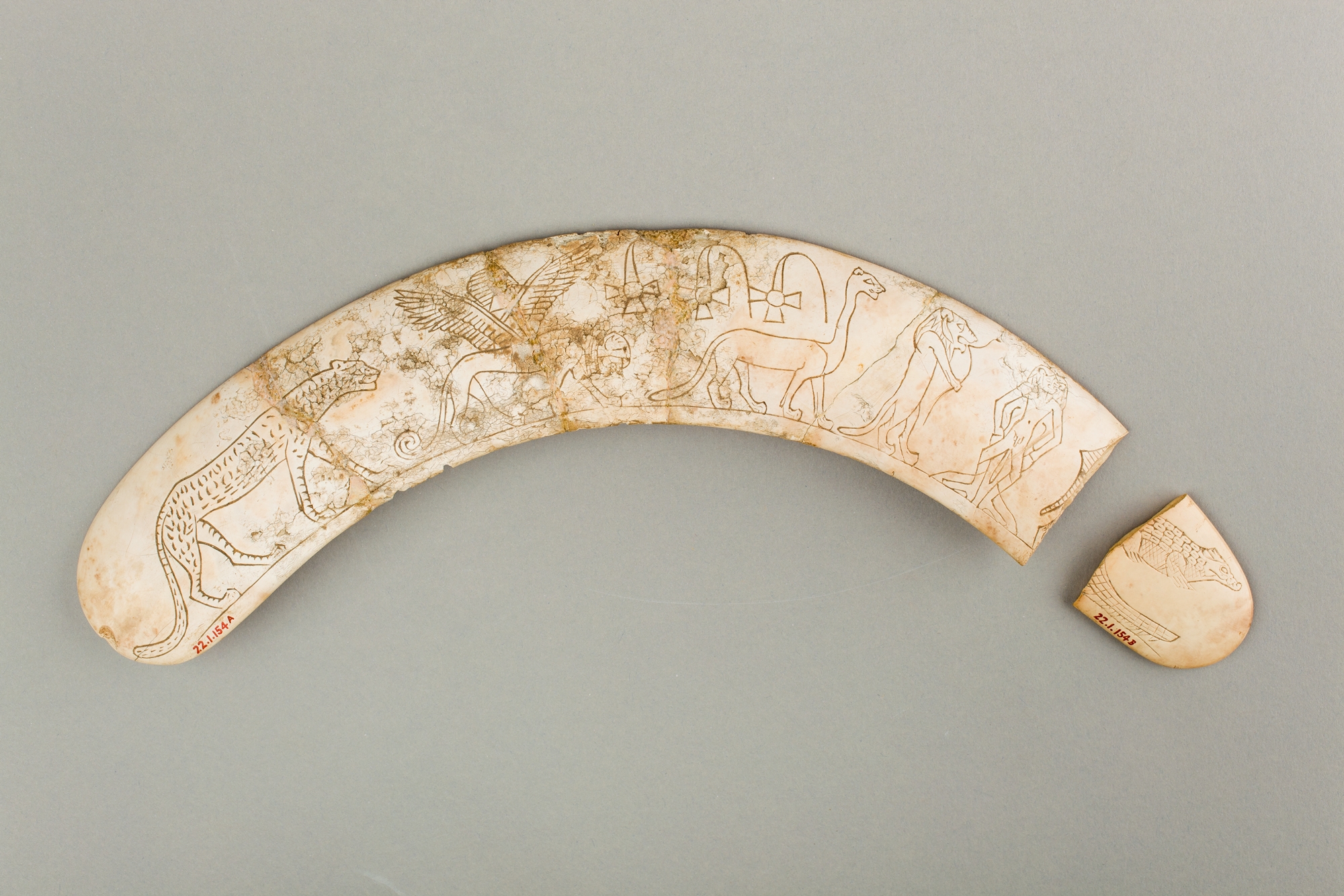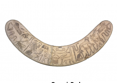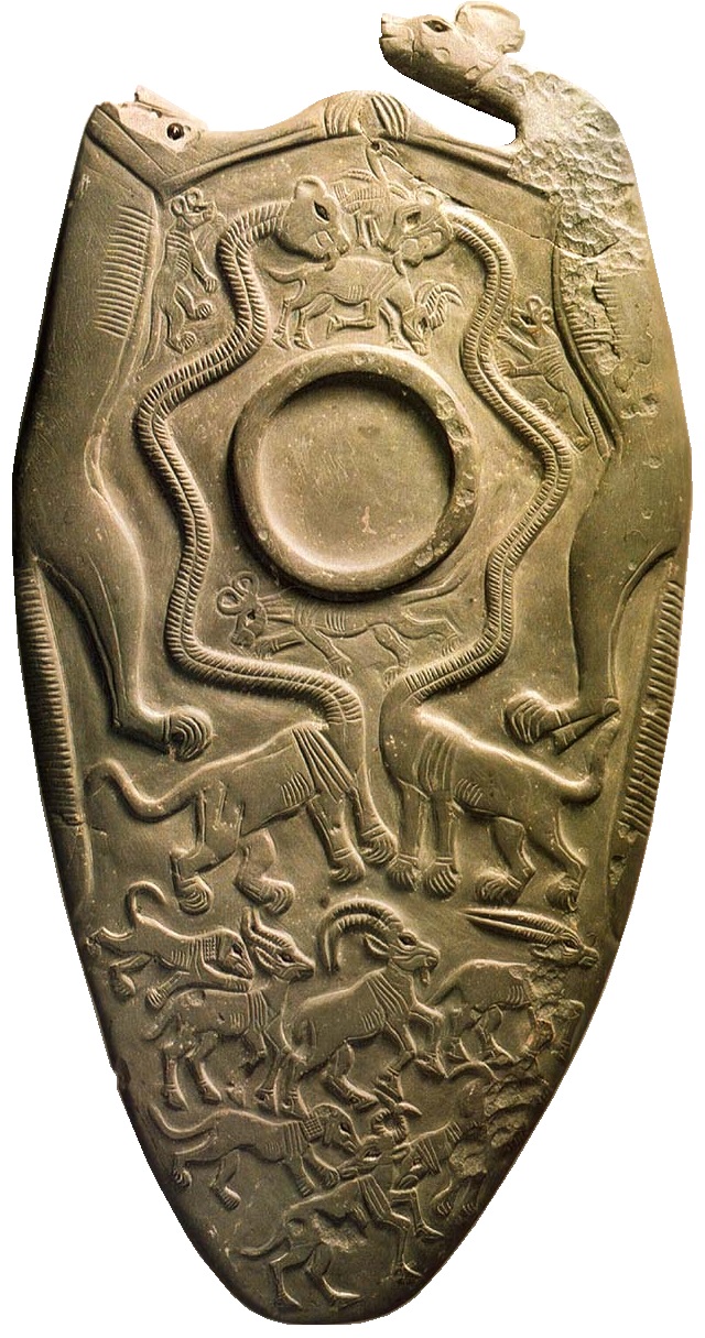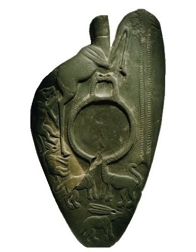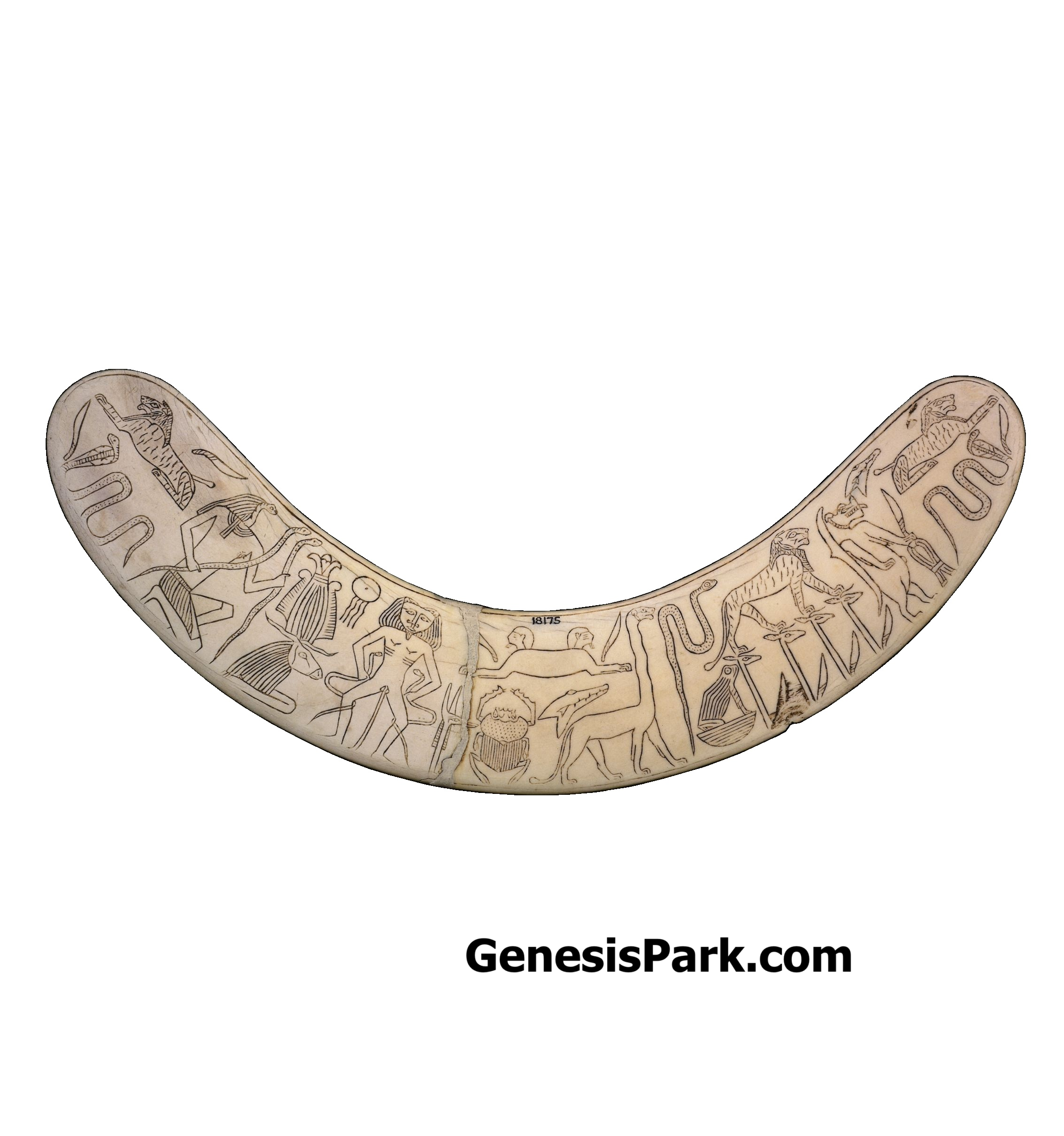 ic wands (or magical “knives”) dating from about 1750 BC display a similar long-necked creature. These artifacts are made from hippo tusk ivory. The one to the right is in the Metropolitan Museum collection, while the one below is currently housed in the British Museum. The preponderance of these long-necked depictions in ancient art motivated archaeologists who do not believe men and dinosaurs coexisted to invent a name for this particular creature. It is called a “serpopard,” supposedly a mosaic of a serpent and a leopard. But for those who believe that man was created in the beginning alongside the great reptiles, these palettes seem to be an attempt to depict a sauropod dinosaur. Note the “Four Dogs Palette” with the “serpopard” cut out for clarity.