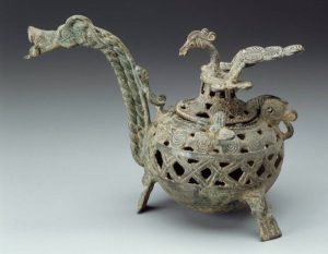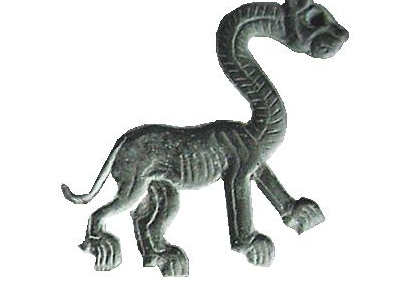 Next we consider some Asian incense burners. To the left is an ancient Thai incense burner pictured in the book Arts of Asia : Materials, Techniques, Styles by Meher McArthur. Curiously enough, it looks like a stylized version of a sauropod, the fossilized bones of which were actually found in Thailand. Notice the birds perched on the back of the dragon, much as we see them do today on the back of a hippo. A similar motif is seen in a Viet incense burner to the right. This cast bronze work is dated to the 3rd century A.D. and is from the Dongson culture. The piece is housed at the Boston Museum of Fine Arts.
